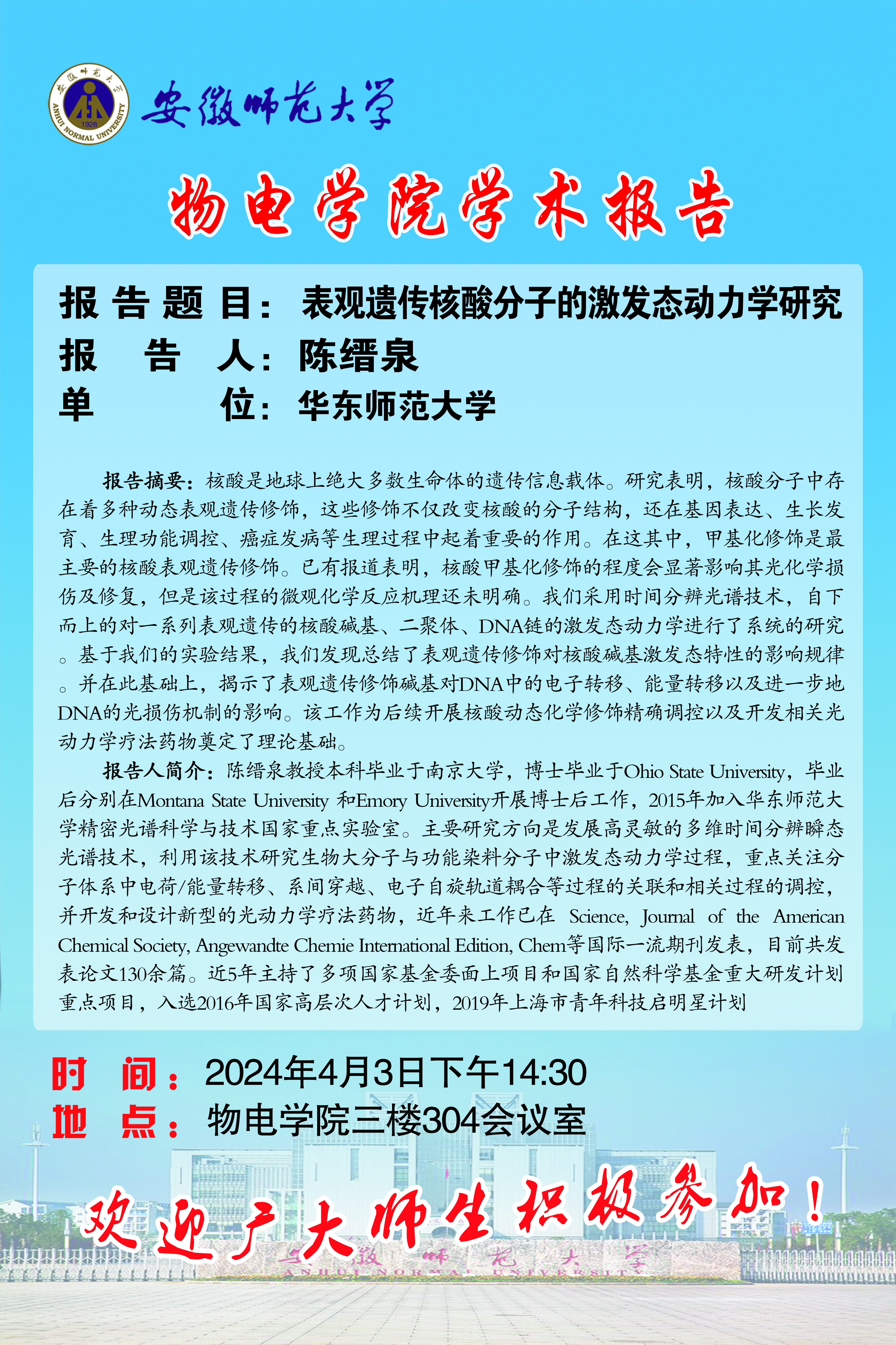 【学术预告】物电讲坛第11期:表观遗传核酸分子的激发态动力学研究