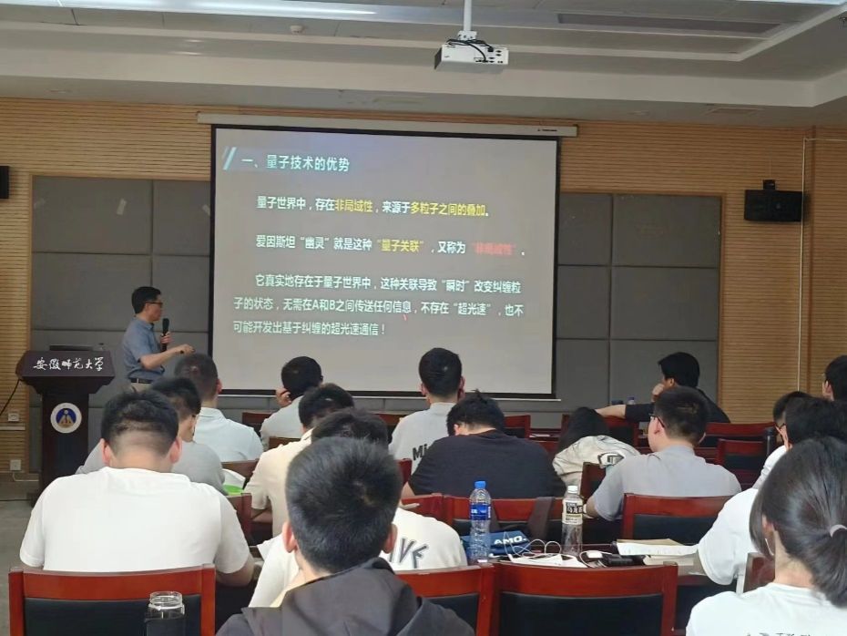 报告会上,项国勇教授首先介绍了量子技术的优势,项教授通过量子比特和经典比特的对比,指出了量子比特在信息编码上的巨大优势。量子比特之间可以发生量子纠缠,无论它们之间的距离有多远。这种关联性使得量子计算机能够进行远程通信和信息传输,而不需要通过物理连接。相比之下,经典比特之间的通信需要通过物理媒介进行传输,受到距离和带宽的限制。由于量子叠加的存在,对量子比特进行测量时,结果的不确定性,使得量子计算机在某些需要处理概率性问题的任务上更具优势,如量子模拟、量子优化等。基于量子比特的量子密钥分发技术可以实现无条件安全的通信。量子比特具有不可克隆性和不可测性,任何对量子比特的尝试窃听或干扰都会导致信息的丢失或破坏,从而确保通信的安全性。然后项教授针对对量子计算机的发展和量子时代信息安全问题做了详细介绍。报告会结束后,与会师生和项国勇教授就相关问题展开了热烈的讨论和交流。