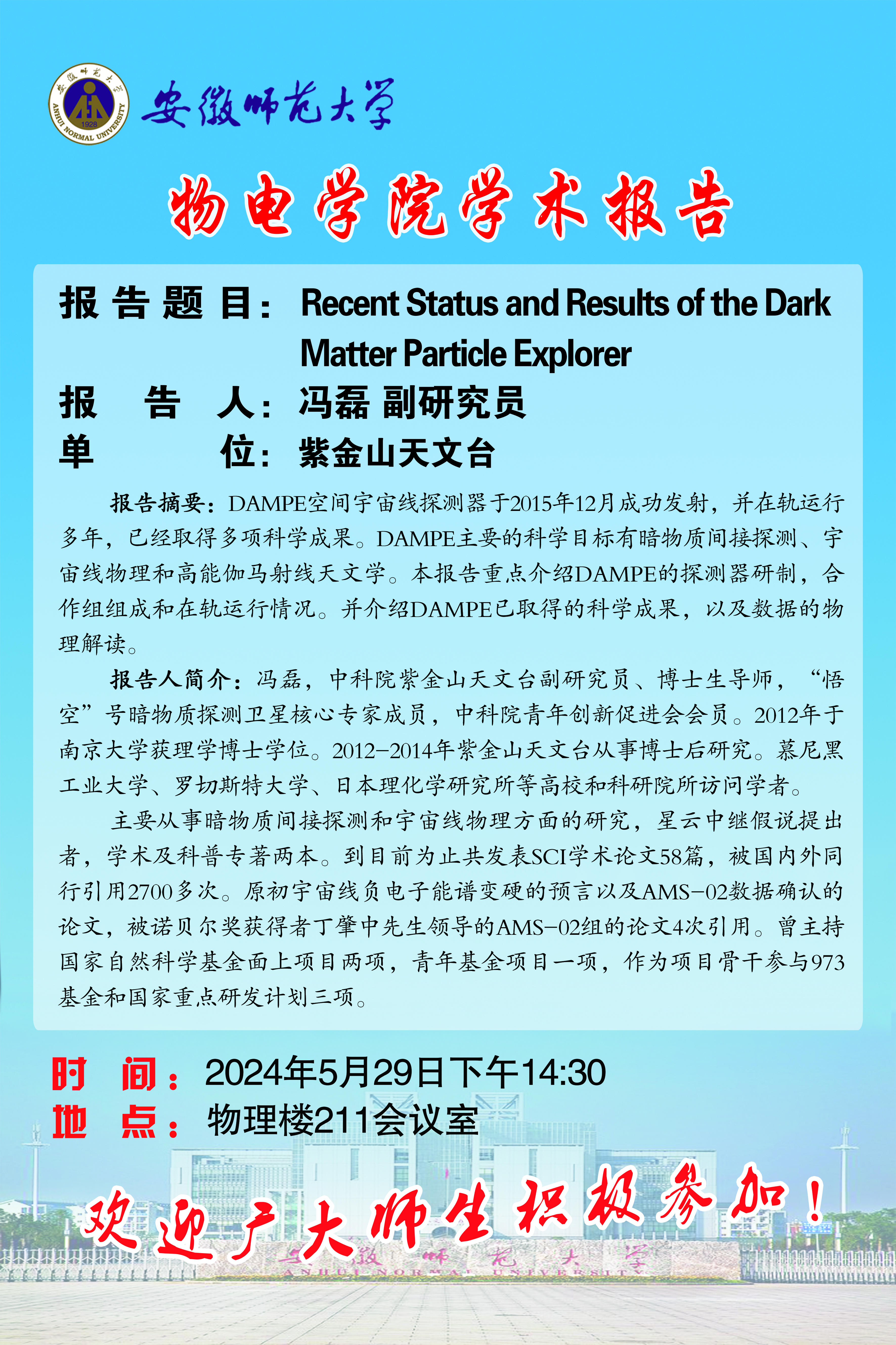 【学术预告】物电讲坛第32期:Recent Status and Results of the Dark Matter Particle Explorer