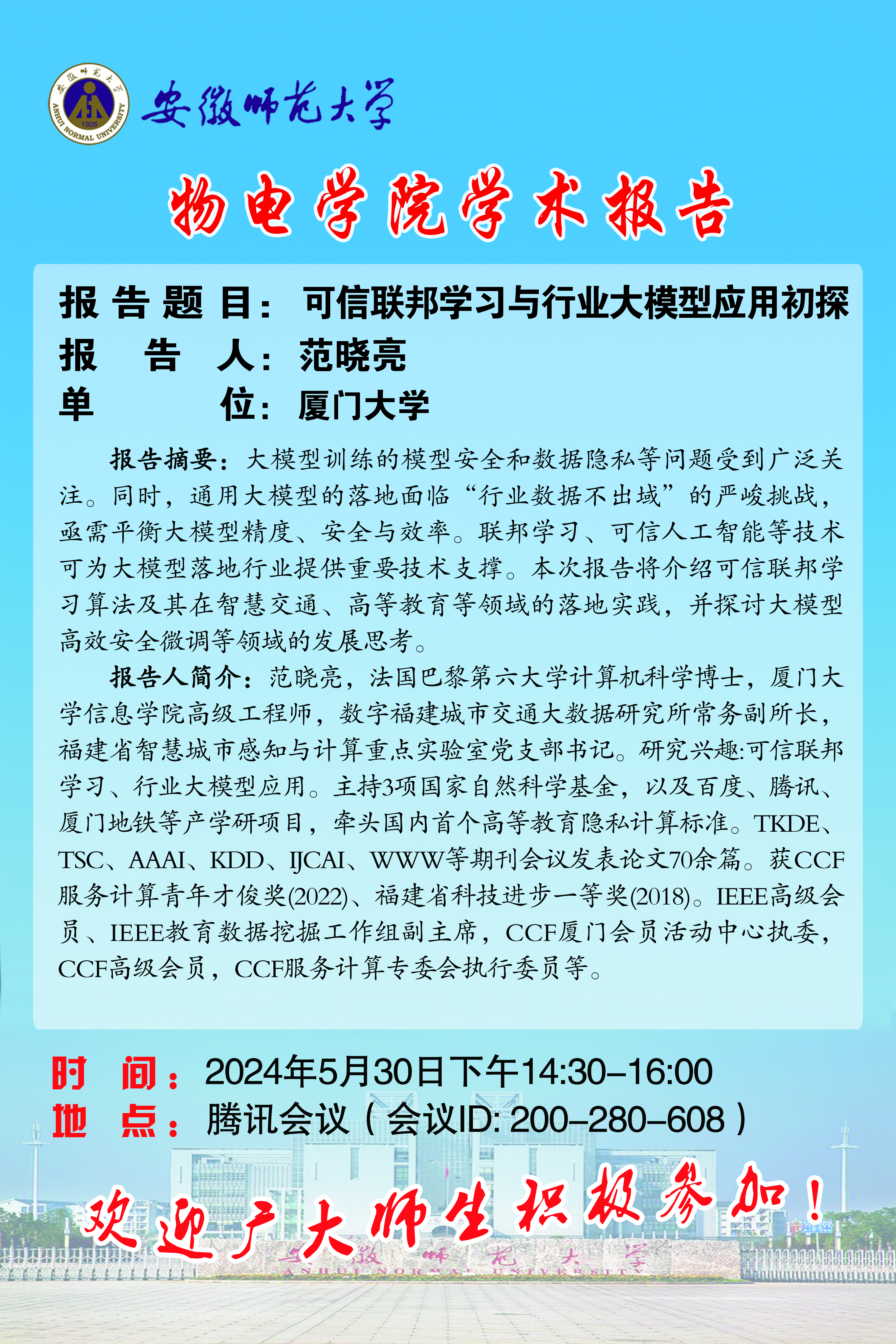 地址:花津校区-安徽省芜湖市九华南路189号 邮编:241000 电话:0553--3869894