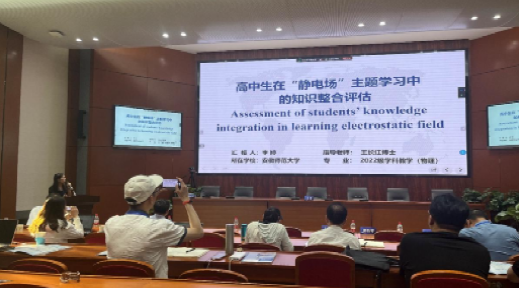 两位研究生李婷和王神姣在会上展示了团队的研究成果。李婷汇报的题目为“高中生在静电场主题学习中的知识整合评估”。她深入分析了高中生在静电场学习中的认知结构和知识应用能力,揭示了员工在知识整合方面的优势与不足,同时提出教师应注重帮助员工实现深入对概念的理解,以提升学习效果。与会专家对其研究成果表示认同,认为其对教学实践具有指导意义。