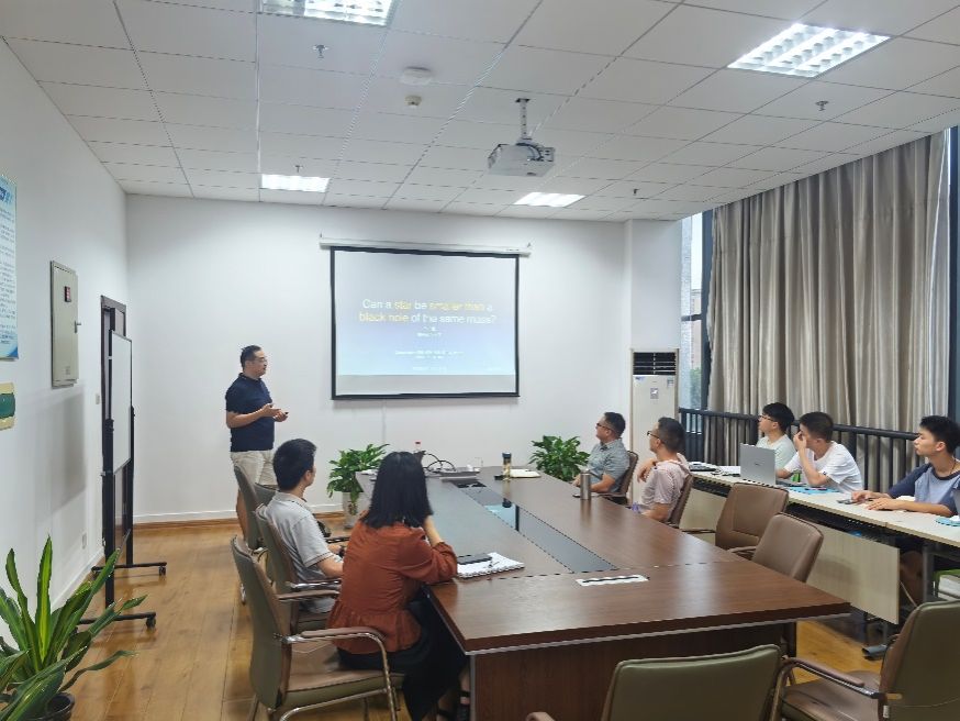 应m88邀请,湖南师范大学李守龙副教授于9月11日来校进行学术交流,并做了题为《Can a star be smaller than a black hole of the same mass?》的学术报告。报告会在公司429会议室举行,会议由m88付成杰博士主持,m88相关师生参加了本次报告会。