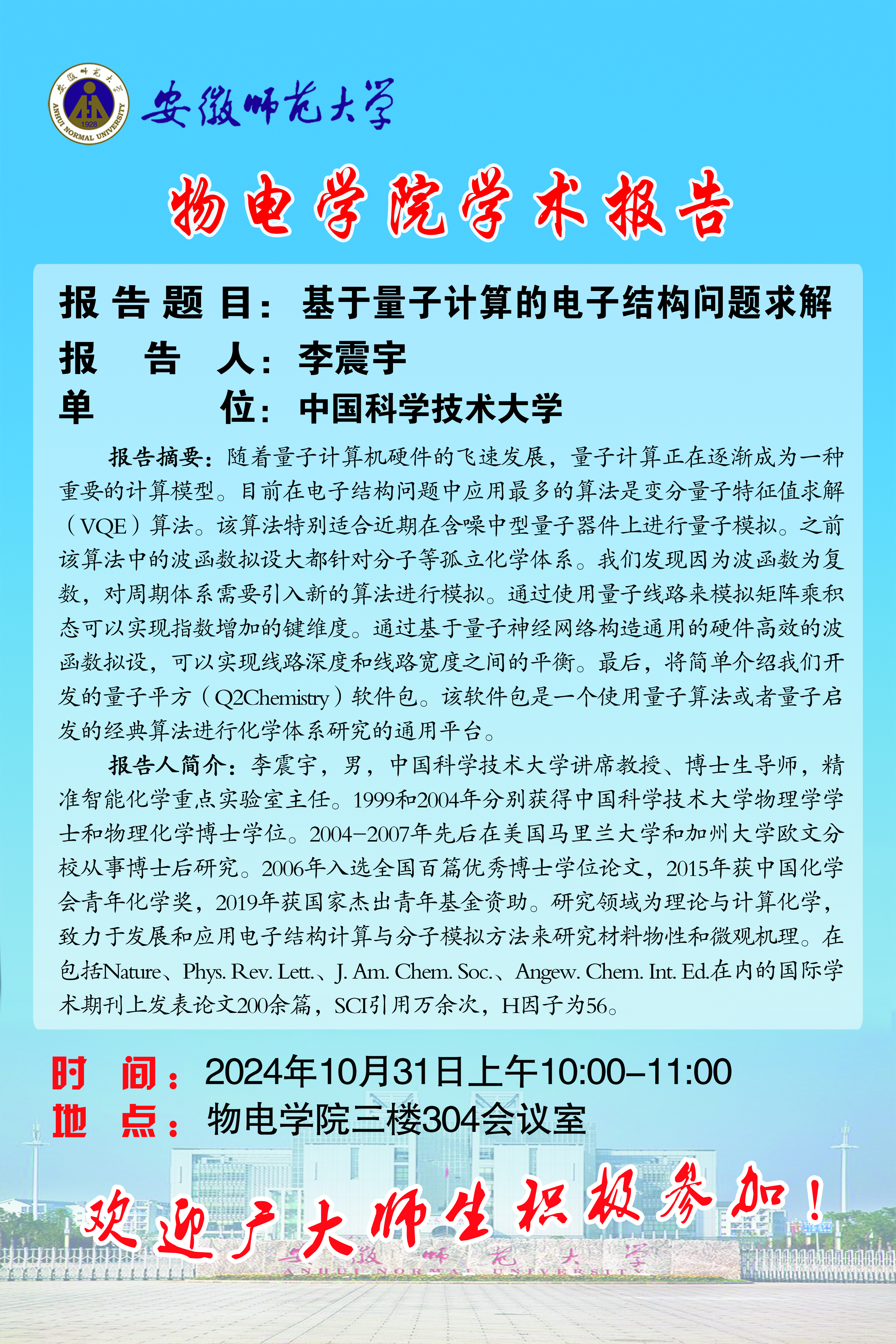 地址:花津校区-安徽省芜湖市九华南路189号 邮编:241000 电话:0553--3869894