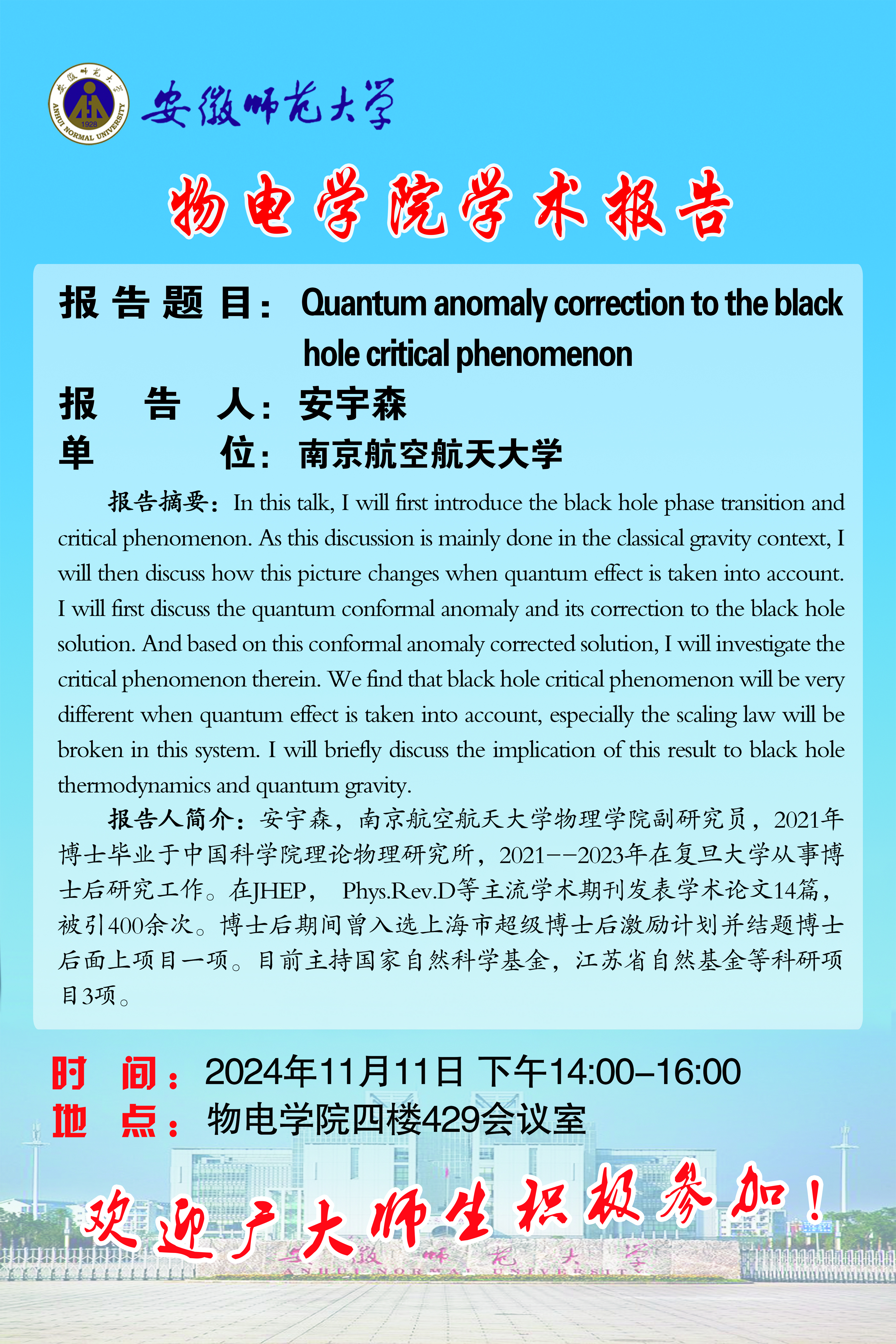 地址:花津校区-安徽省芜湖市九华南路189号 邮编:241000 电话:0553--3869894