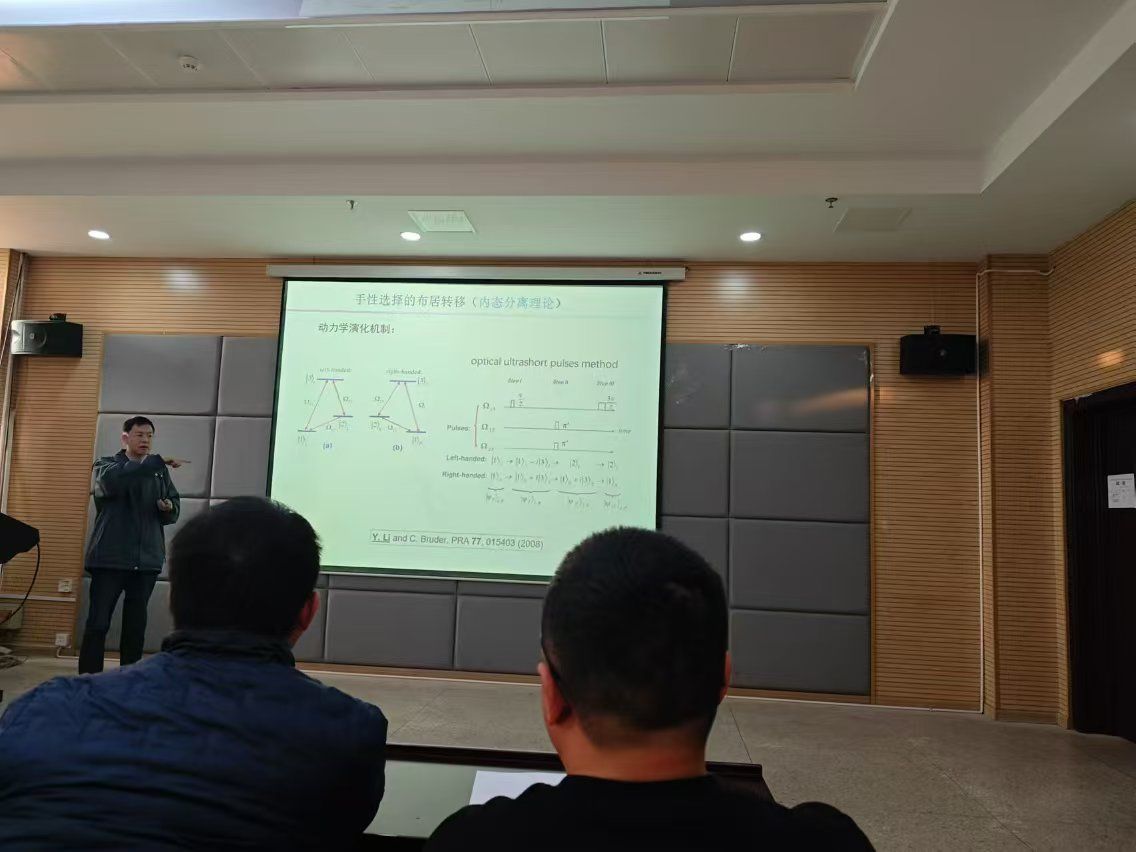 报告会上,李勇教授讲述了与自身镜像无法通过平动或转动重合的分子被称为手性分子。手性分子和它的镜像互为手性异构体。虽然手性异构体有许多相同的物理性质,但是它们却具有完全不同的化学性质和药理功能。特别是药理方面,同种分子的一种手性异构体能治病,而另一种手性异构体可能无效、有副作用、甚至致命。因此手性分子的研究在医药方面具有非常重要的意义。从本世纪初,人们开始研究基于电偶极相互作用形成的循环三能级手性分子模型,在这样的模型中,左右手性分子将有依赖于手性的不同量子性质,从而可以采用量子力学的方法来进行手性分子的分离、检测和转化。报告会结束后,与会师生就相关问题同李勇教授展开了热烈讨论和交流。