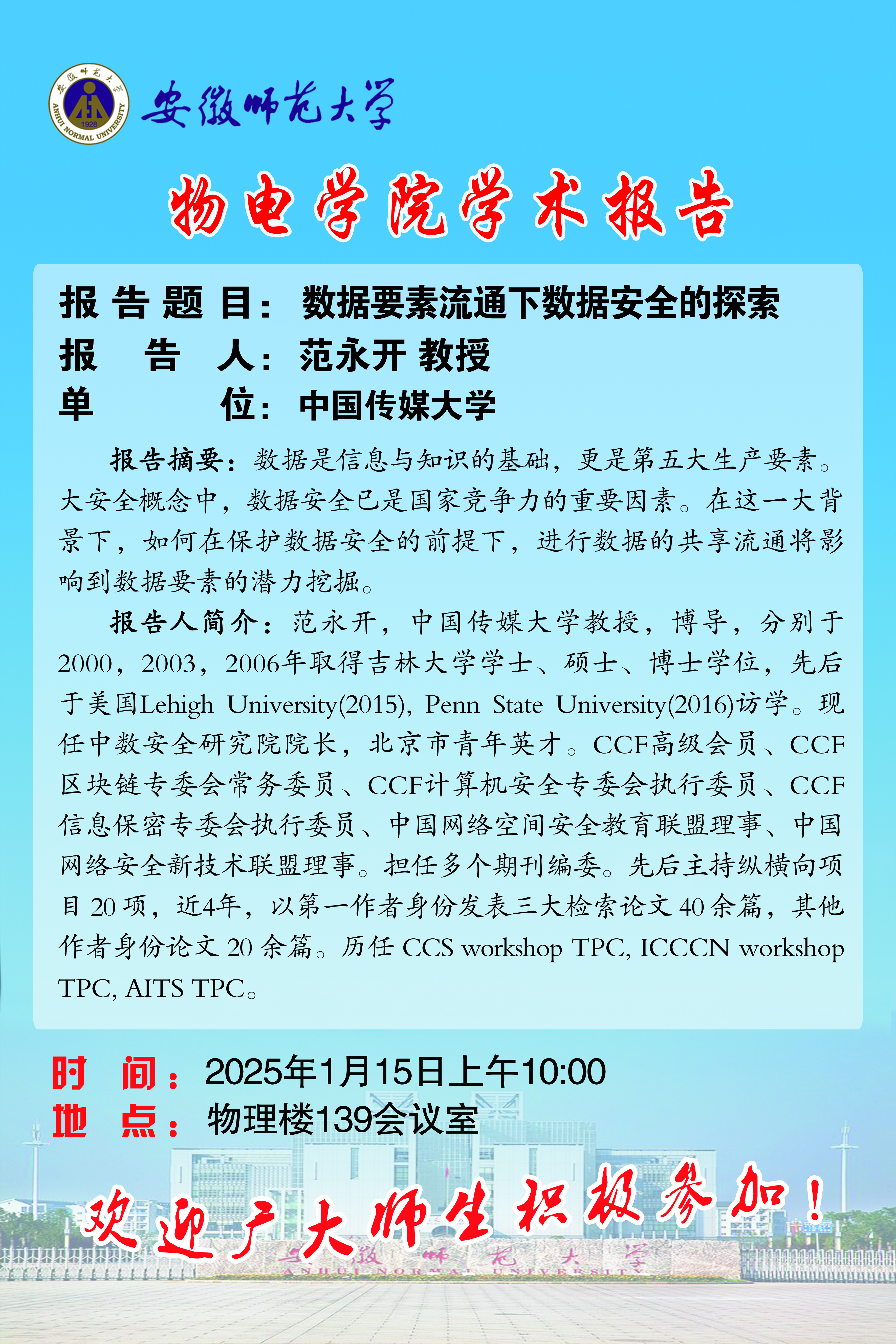 地址:花津校区-安徽省芜湖市九华南路189号 邮编:241000 电话:0553--3869894
