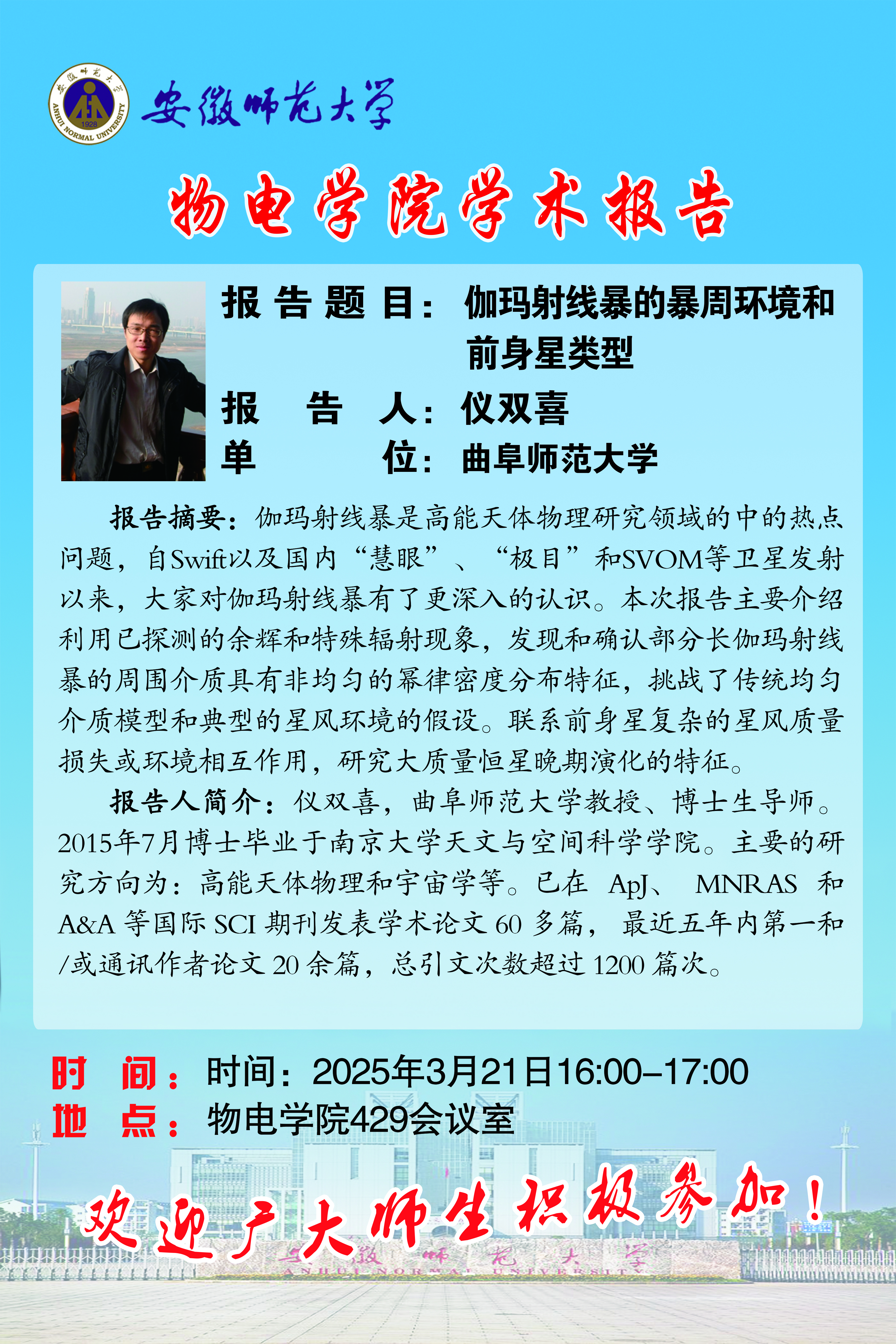 【学术预告】物电讲坛2025年第8期:伽玛射线暴的暴周环境和前身星类型