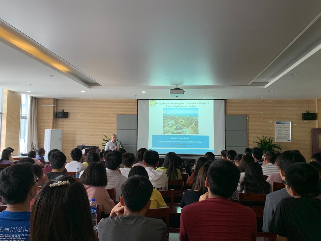 在本次报告中, Continetti教授首先为大家讲解了专门用于研究气相小分子反应动力学的光电子-光解碎片符合谱技术;随后详细讲述了利用这一技术研究丙烯基氧阴离子在1.6和3.2电子伏光子激发下的能级跃迁与动力学过程的最新成果。Continetti教授指出:该研究在低温小分子自由基离子中首次观测到了被延迟的光电子发射现象,揭示了双自由基中复杂的电子结构,为实现光解离反应的共振调控提供了一种可能的新方法。讲座结束后,与会的各位老师和同学就自己关心的问题与Continetti教授展开深入交流与讨论。