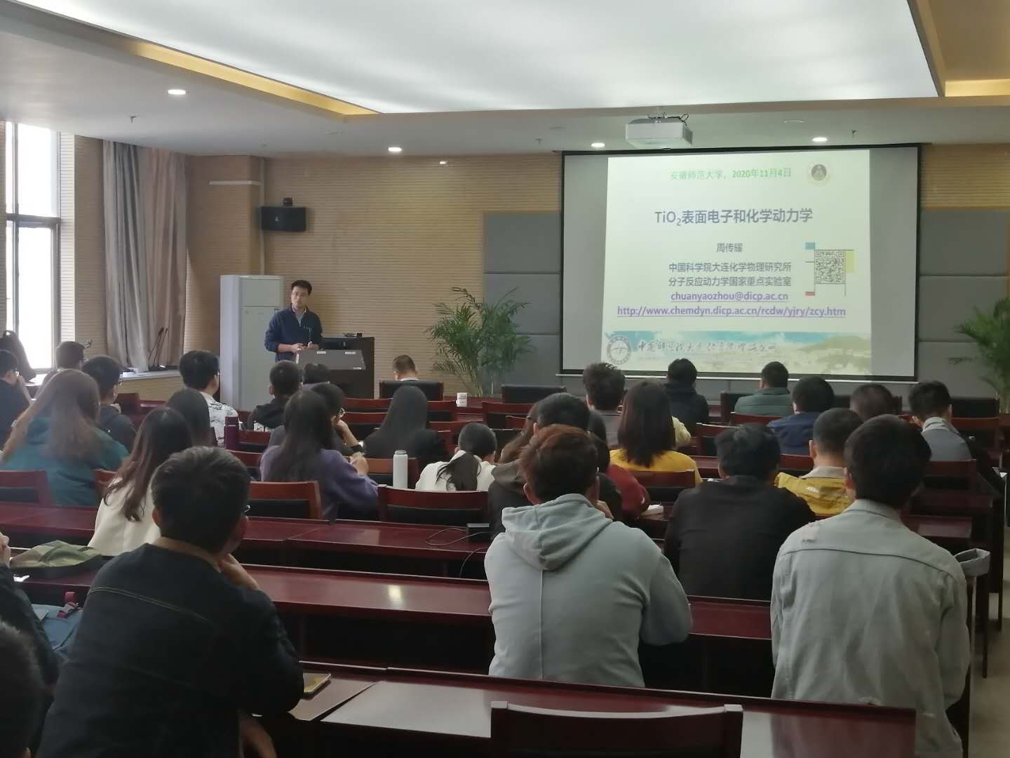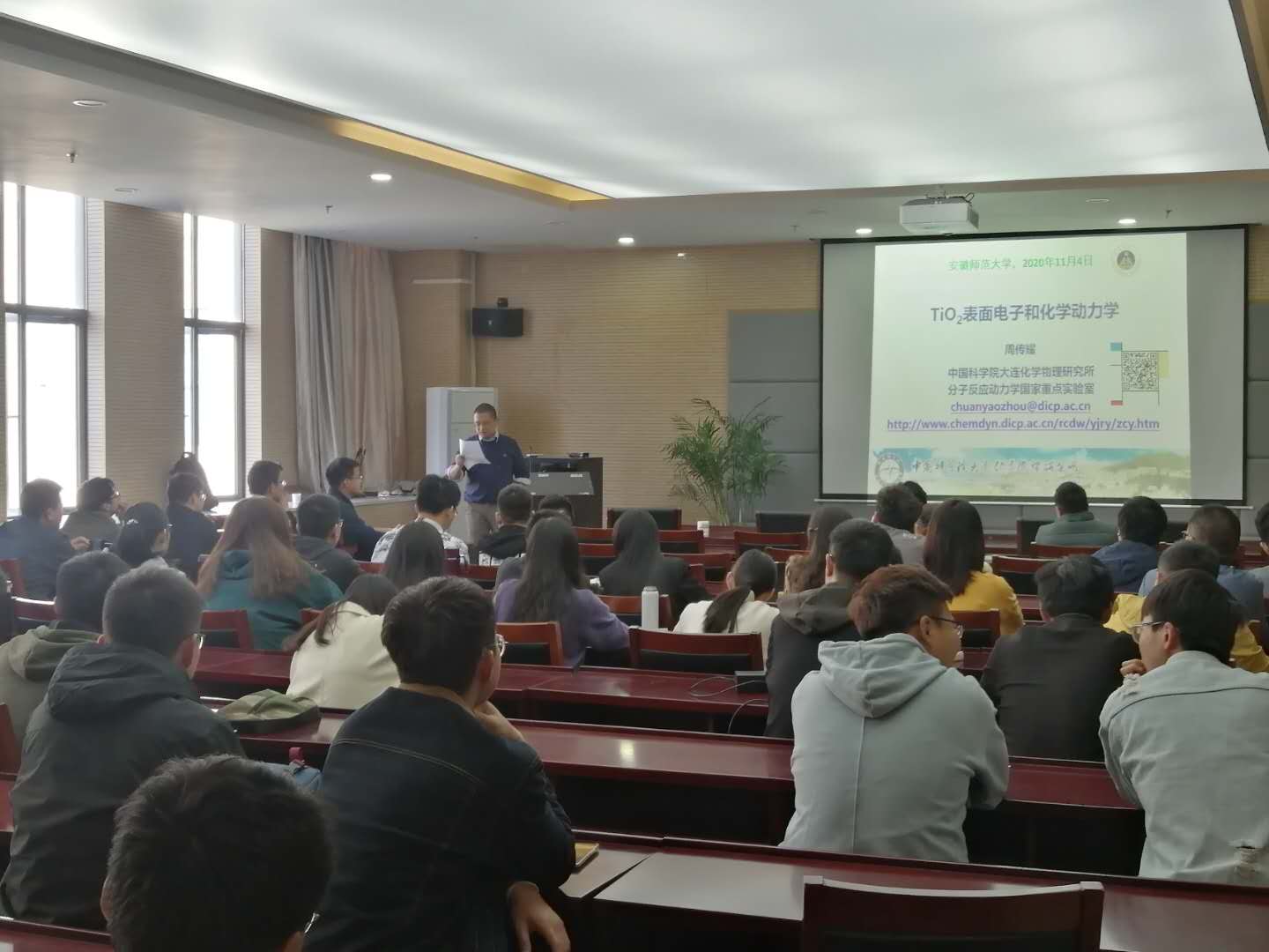 在本次报告会上,周传耀研究员首先对TiO2光催化分解水制氢的研究背景以及光电子能谱、自由电子激光的技术特点进行了介绍。随后,他详细阐述了双光子光电子能谱、原位质谱、扫描隧道显微镜等技术在TiO2表面电子及反应动力学研究中的相关应用,重点讨论了甲醇分子在TiO2(110)晶体表面的光催化反应机制,并对基于高次谐波的时间分辨角分辨极紫外光电子能谱和基于X射线自由电子激光的时间分辨X射线光谱等新技术在该领域中的应用进行了展望。周传耀老师在报告会上向与会师生介绍了课题组的最新研究成果及其科学影响,使同学们更加憧憬未来自己的科研道路。与此同时,他还鼓励在场同学打好专业基础,开阔学术视野,争取在科研领域做出开拓性的工作。报告会结束后,与会的各位老师和同学就自己关心的问题与周传耀老师展开了热烈讨论和详细交流。