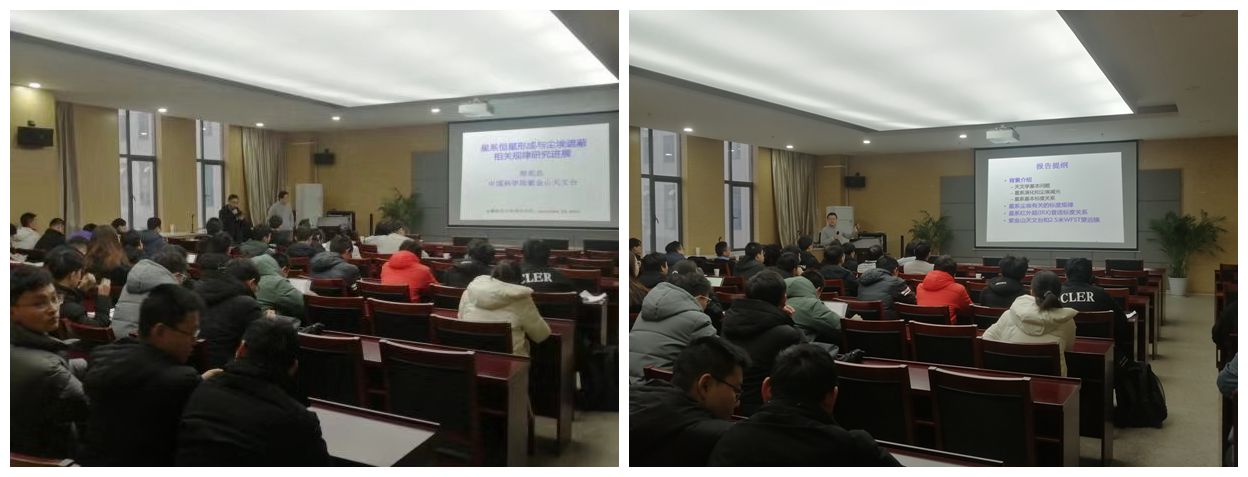 在本次报告会上,首先郑宪忠老师介绍了天文学的基本问题以及星系演化和尘埃消光,对星系形成演化的物理过程进行了解释。在此基础上介绍了星系恒星形成有关的标度规律,随后又介绍了宇宙恒星形成的历史并强调了其中尘埃消光的关键作用。详细的对恒星形成星系的主序关系和普适的尘埃消光规律这一最新研究进展进行了诠释。最后介绍了紫金山天文台以及科大-紫台共同建设的2.5米WFST望远镜。报告会结束后,与会的各位老师和同学就自己感兴趣的问题与郑宪忠老师展开了热烈讨论和详细交流。学术报告取得了积极的学术交流效果。