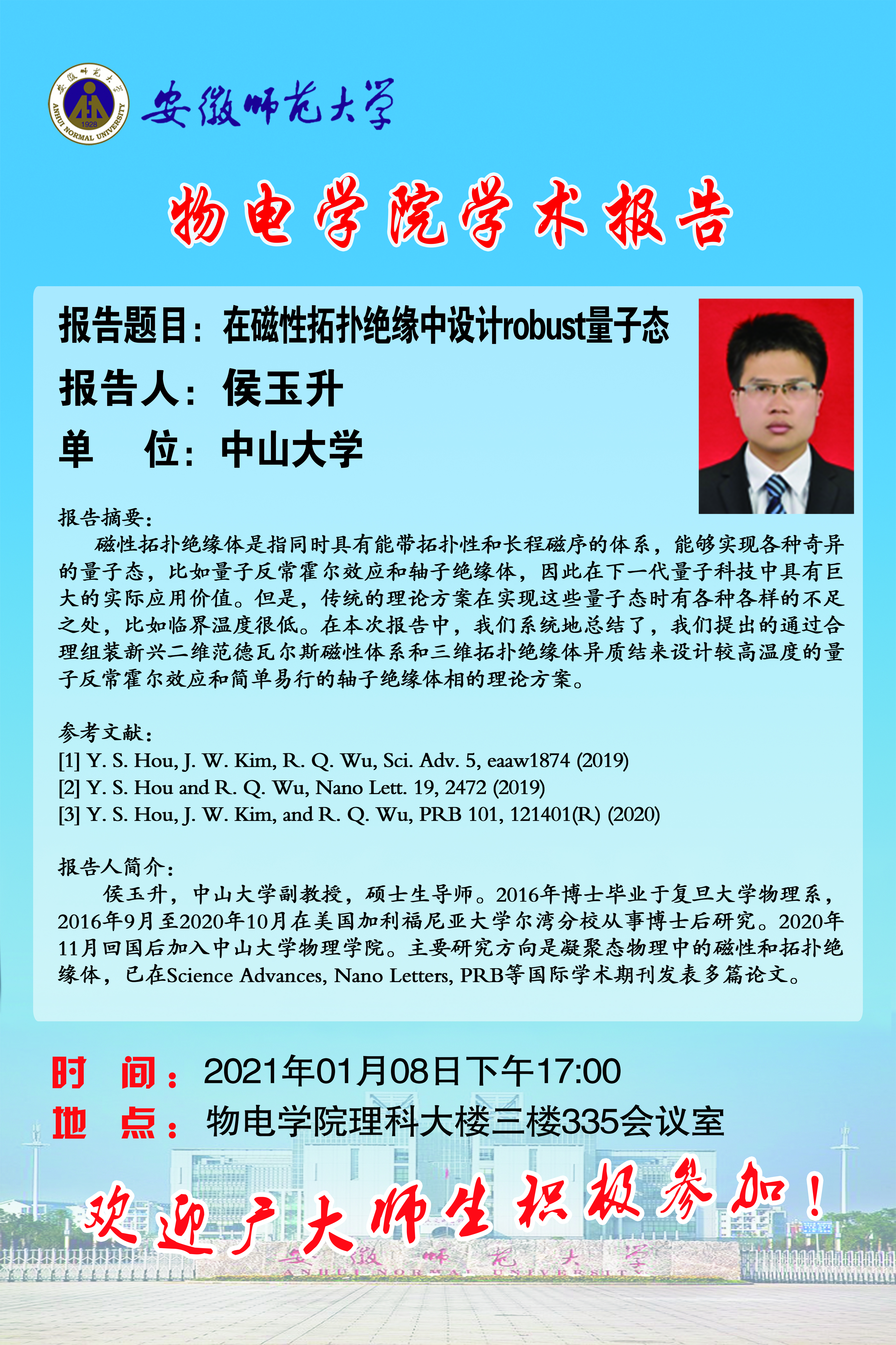 【学术预告】侯玉升:在磁性拓扑绝缘中设计robust量子态