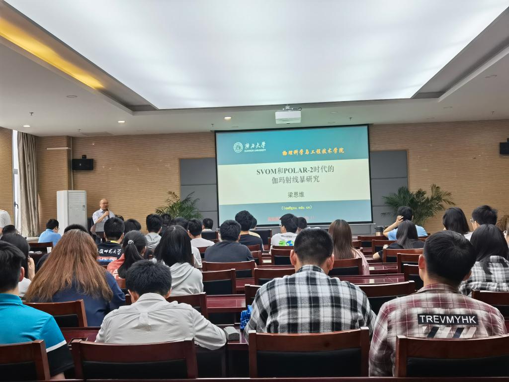 在本次报告会上,梁恩维教授首先对伽玛射线暴的研究背景做了简单介绍,然后详细阐释了中法合作的SVOM卫星项目、空间站POLAR-2项目以及相关的基光学观测系统的研制进展。梁教授指出这些望远镜项目对伽玛射线暴研究带来的潜在历史机遇,并向与会的师生介绍了广西大学天体物理团队最新研究成果及其科学影响。报告会中,梁恩维教授鼓励同学们打好专业基础,开阔学术视野,争取在自己的科研领域做出开拓性的工作。报告会结束后,与会的各位老师和同学就自己关心的问题与梁恩维教授展开了热烈讨论和详细交流。