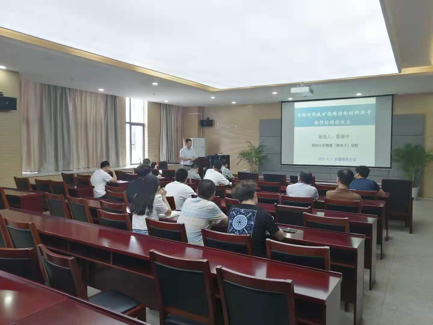 本网讯(m88)应m88邀请,郑州大学郭海中教授于6月7日来校开展学术交流,并作了题为《外场对钙钛矿低维结构材料新奇物性的调控效应》的学术报告。报告会在公司304会议室举行,会议由陆洲教授主持,m88部分老师和研究生参加了本次报告会。