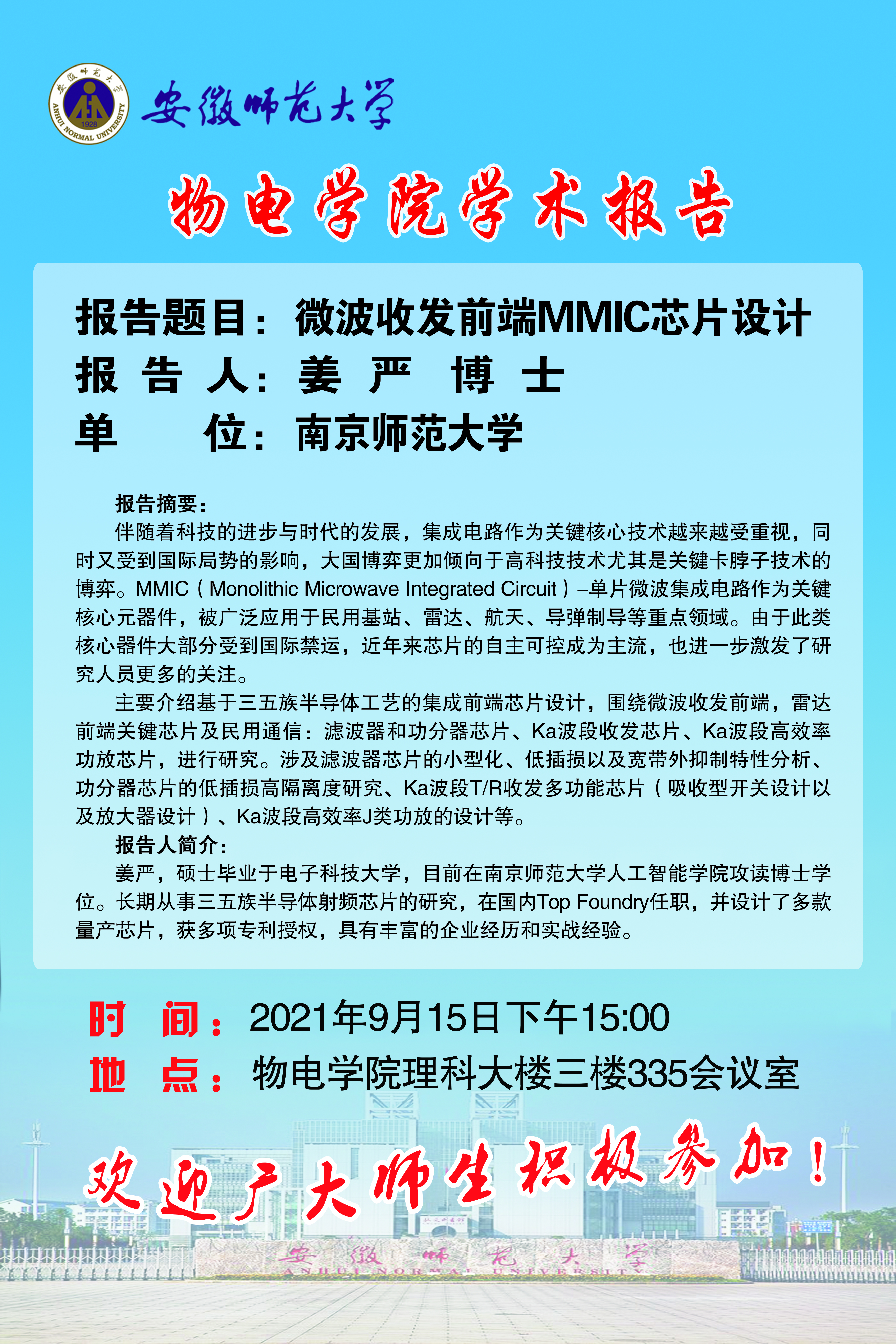 地址:花津校区-安徽省芜湖市九华南路189号 邮编:241000 电话:0553--3869894
