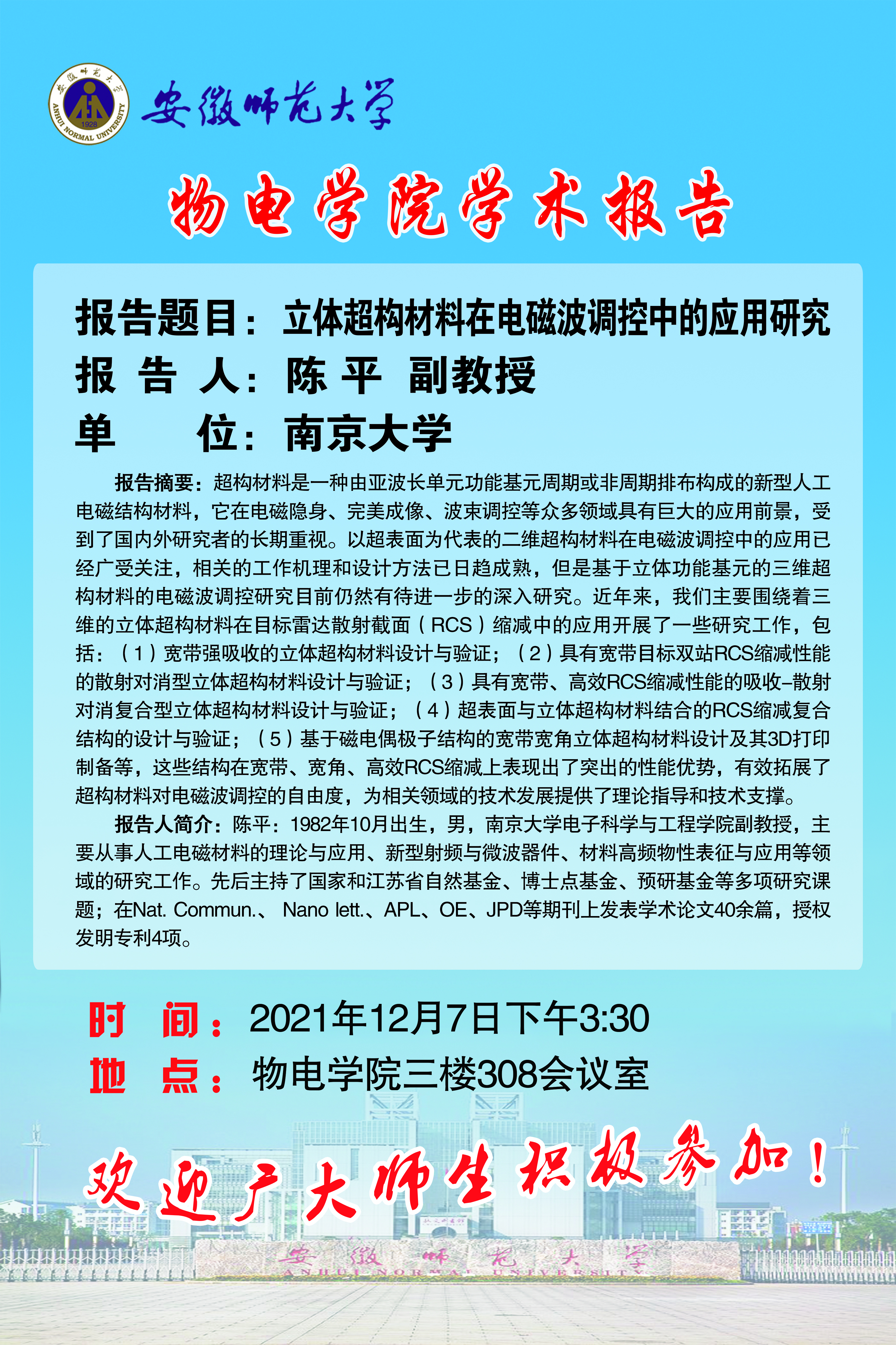 地址:花津校区-安徽省芜湖市九华南路189号 邮编:241000 电话:0553--3869894