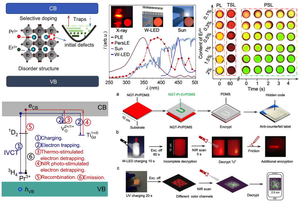 近期,m88宁利新教授与华南理工大学夏志国教授团队合作,设计利用掺杂稀土离子丰富电子能级及荧光发射特征与基质材料合适缺陷能级特性,在NaGdTi2O6:Pr3+, Er3+荧光材料中实现了五种激励模式的光发射。在各种外激励作用下,包括从X射线到近红外的光激励、热激励、以及力激励,可以实现静态和动态强光发射;基于第一性原理计算,识别了主要相关缺陷并厘清了动态发光机理;设计演示了该材料在荧光防伪技术中的应用。相关研究成果近日已发表在国际著名期刊《自然•通讯》上,标题为“Interplay of defect levels and rare earth emission centers in multimode luminescent phosphors(Nature Communications, 13:7589 (2022), https://doi.org/10.1038/s41467-022-35366-3)。另外,本工作被杂志编辑分别选为“无机与物理化学”和“材料科学与化学”领域的亮点文章。(Editors’ Highlights, https://www.nature.com/collections/wtpqpqpgwd, https://www.nature.com/collections/eecgdgijhh)