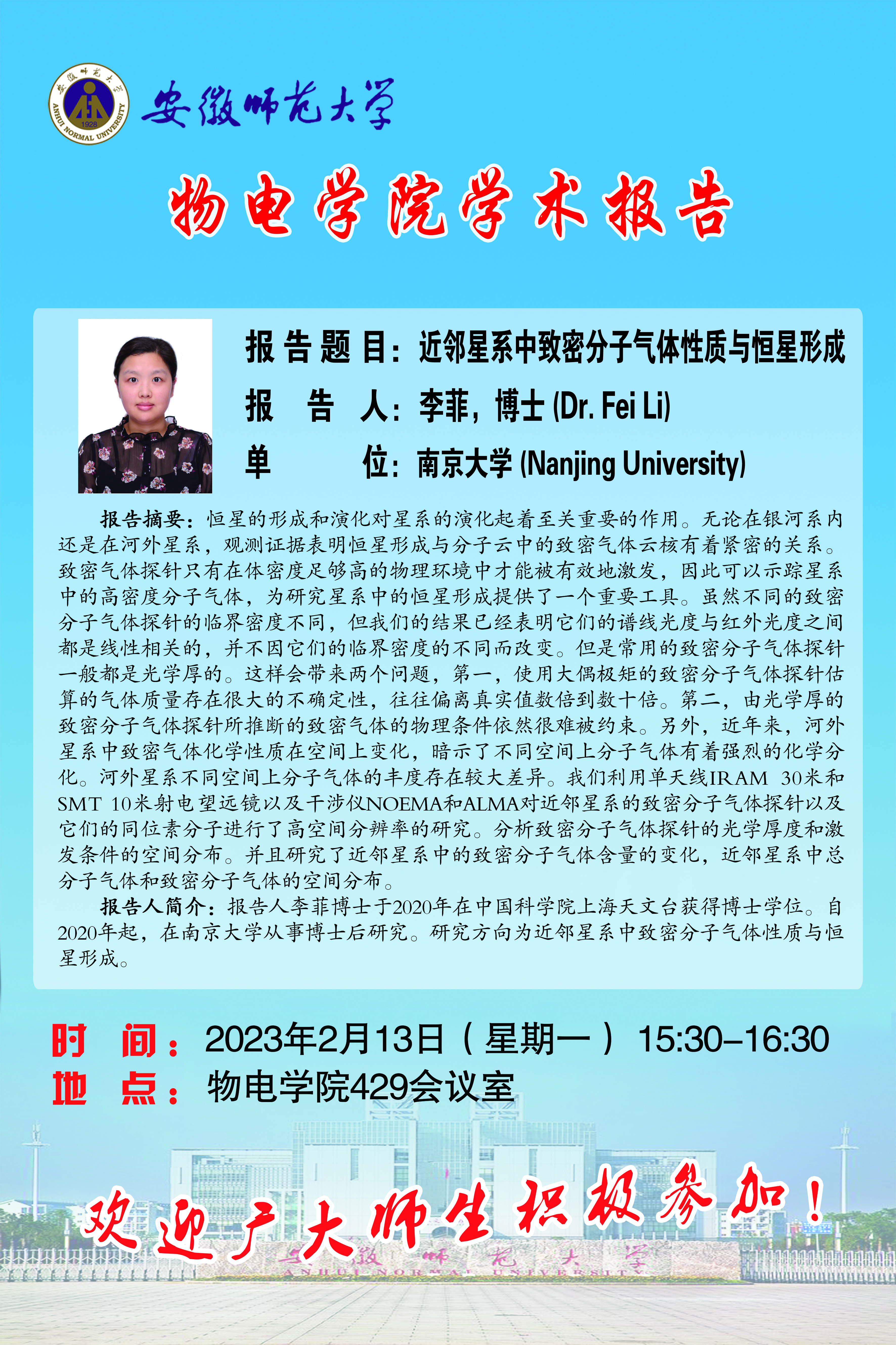 【学术预告·物电讲坛】李菲:近邻星系中致密分子气体性质与恒星形成