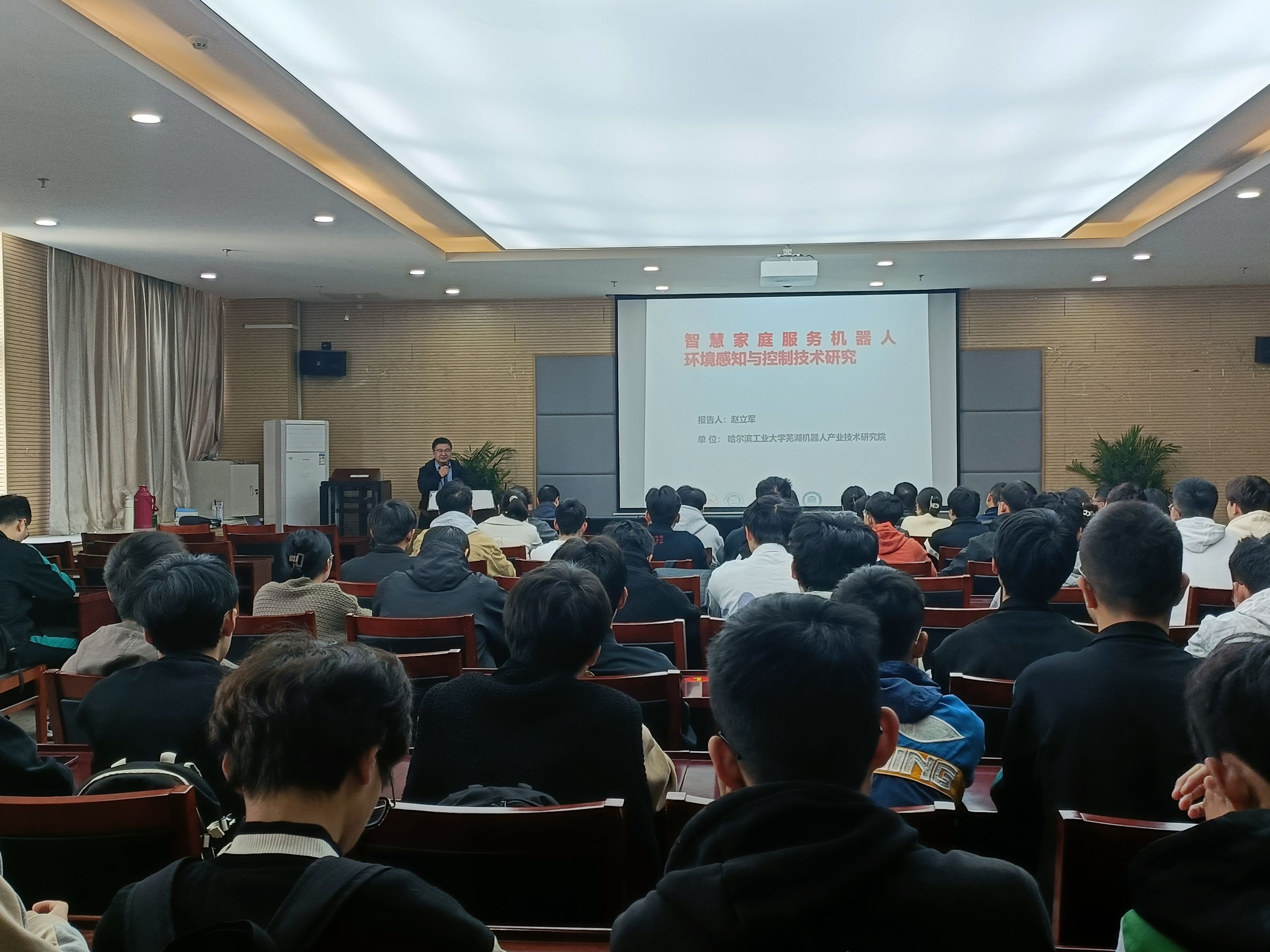报告会上,赵立军教授首先就家居环境机器人的研制背景、目前存在的问题以及相关研究进展进行了简要概述。随后,赵立军教授为大家阐述了针对服务机器人对环境与物品的认知理解能力弱等问题,家居环境智能空间需重点突破环境物体三维检测、家庭环境智能空间一体化知识表征、复杂动态环境的语义感知与建模、面向服务操作的物品高效检测与深层认知等关键技术。同时,赵教授从机器人移动底盘涉及与运动控制、机器人环境感知与自主导航设计、刚柔耦合灵巧手系统的设计、机械臂手系统灵巧操控与安全控制技术等四个方面详细说明了家用服务机器人的关键技术与系统。报告会上,赵教授同与会师生分享了课题组关于智能家庭机器人研制、智慧家庭场景及服务的知识化表征、复杂非结构化环境的语义感知与建模等的研究进展。报告会结束后,与会师生就相关问题同赵立军教授展开了热烈讨论和交流。