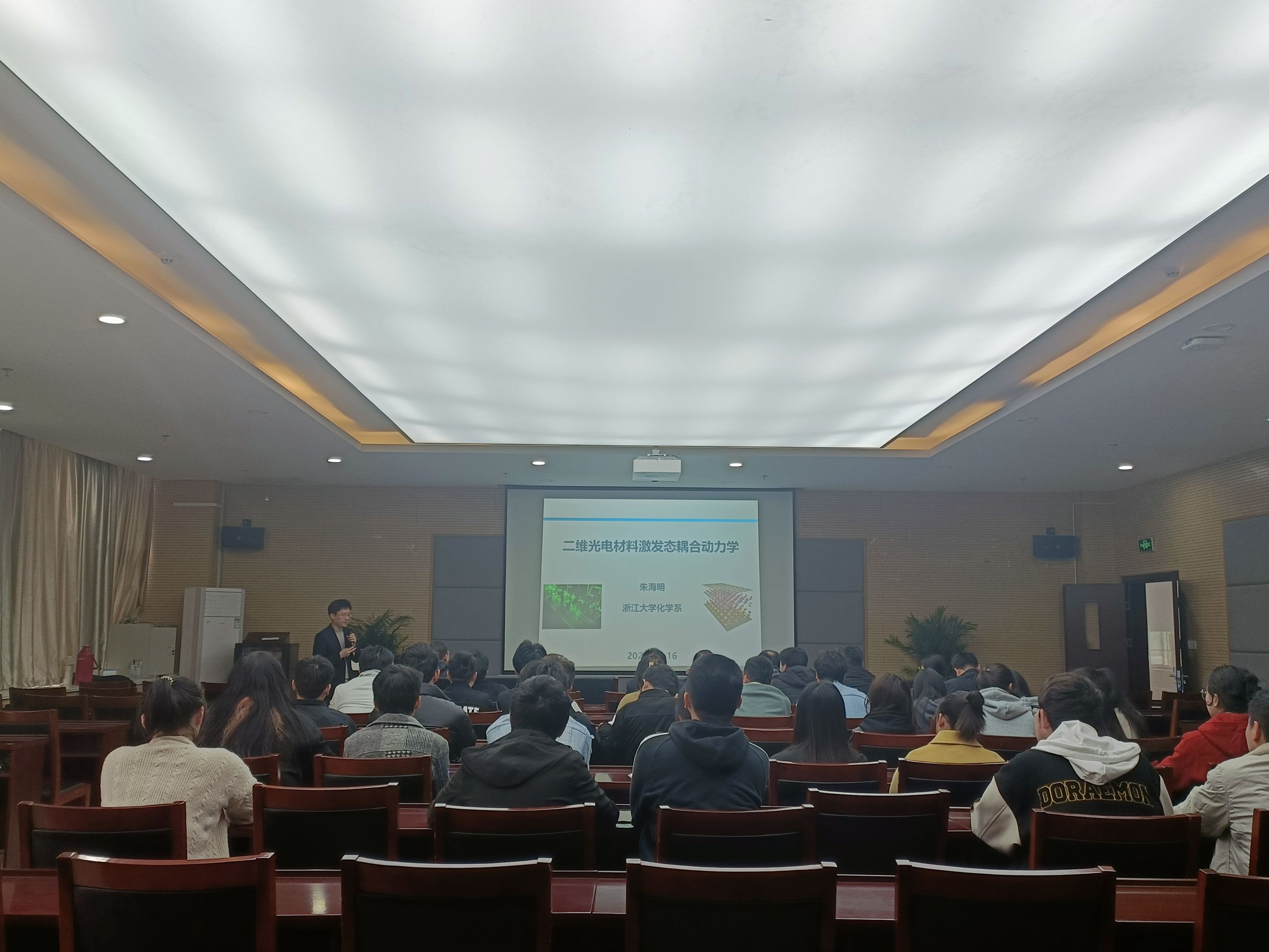 报告会上,朱海明教授阐述了新型低维半导体材料的体相和界面的超快动力学过程,包括激发态的空间结构和电子结构性质,电荷和能量的迁移等跟太阳能转化、光电探测和材料发光应用紧密相连的过程。新型低维半导体材料由于独特的性质,是当前光-电-化学能源转换的研究热点。半导体材料吸收光后的激发态动力学和性质直接决定了光电转换器件的性能优化和设计原理,具有重要的指导作用。在传统的三维半导体(如Si)中,激发态载流子的动力学行为通常可以用单电荷图像来描述。但是,低维半导体材料由于增强的电子-空穴和电子-晶格相互作用,激发态电子-空穴和电子-晶格的运动通常会耦合起来,单电荷运动图像往往不再适用,光电转换过程和机制被深刻影响甚至重塑。随后,朱海明教授同与会师生分享了课题组的工作进展。对于激发态本征过程,由于电子-晶格耦合极化效应,激发态激子和晶格耦合在一起形成激子极化子,为长期困扰光电转换领域的激子解离、荧光拖尾和电压损耗提供了动力学机理阐释和解决思路;对于激发态界面过程,由于电子-空穴库伦相互作用,界面激子转移过程通过分步协同电荷转移传能新机制,实现了高效率暗激子传能捕获和上转换发光。报告会结束后,与会师生就相关问题同朱海明教授展开了热烈讨论和交流。