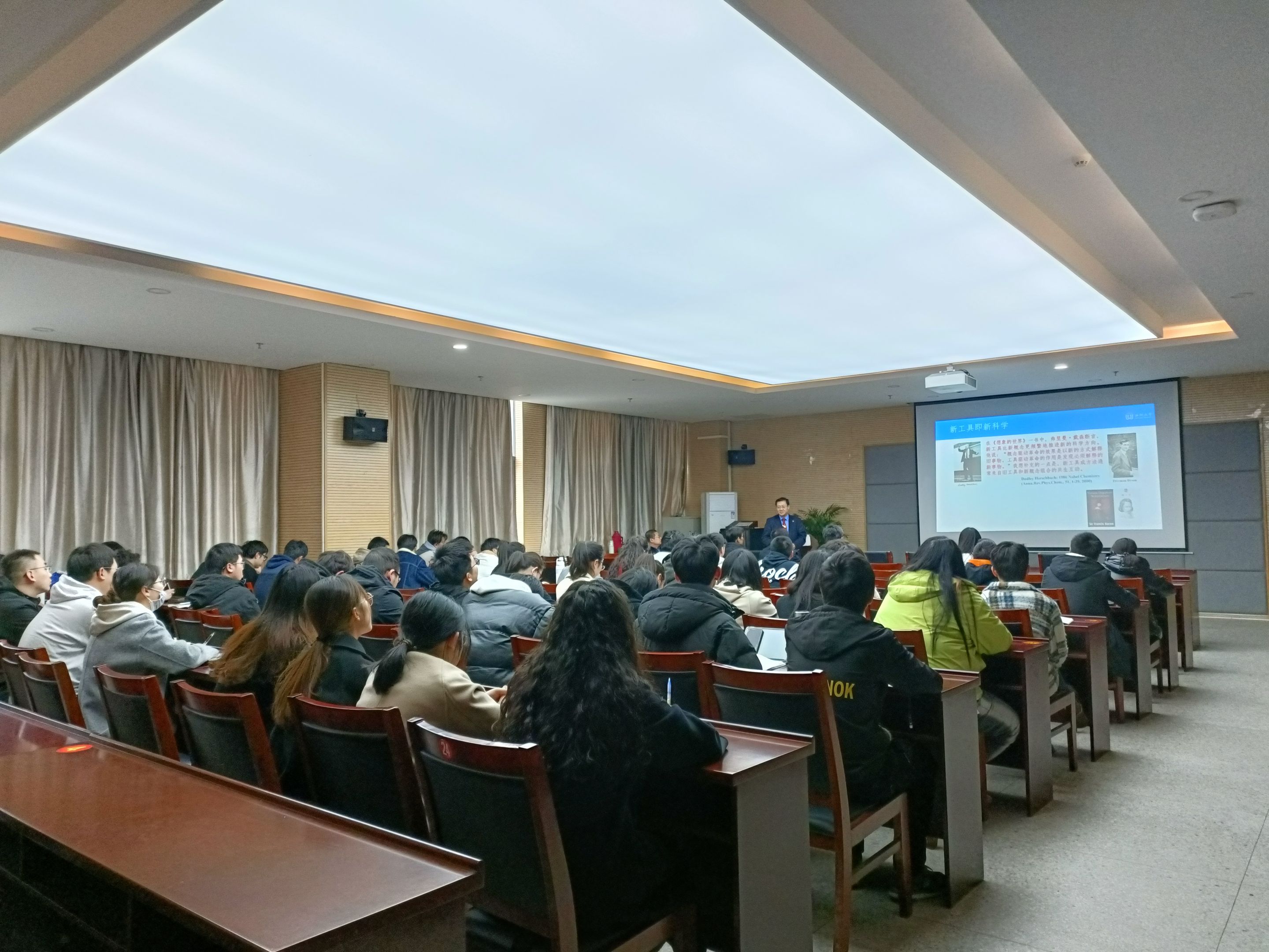 报告会上,王鸿飞教授阐述了和频振动光谱的研究背景及其应用场景。和频振动光谱具有独特的界面选择性和亚单分子层灵敏性,已经成为研究表面和界面分子结构、相互作用和动力学过程的有力工具。近年来,和频振动光谱研究在光谱标识、准确测量和定量分析各方面的诸多困难大多已被克服,为解决化学、能源、材料、环境与生命科学中广泛存在的表面和界面科学问题提供了新的机遇。报告会上,王鸿飞教授同与会师生分享了课题组在和频振动光谱方面的研究进展,并对新的研究方向和机会进行了展望。报告会结束后,与会师生就相关问题同王鸿飞教授展开了热烈讨论和交流。