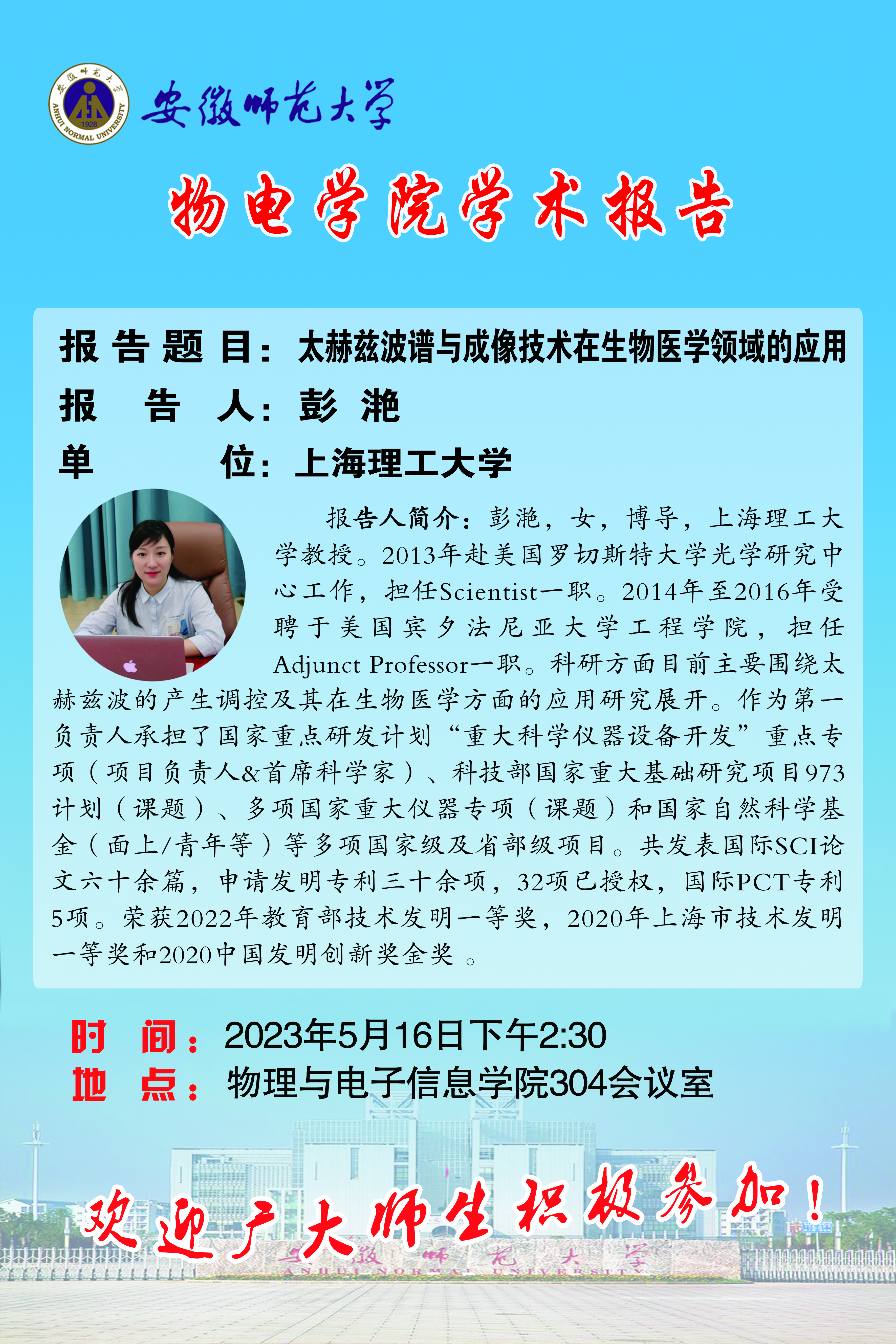 【学术预告·物电讲坛】彭滟:太赫兹波谱与成像技术在生物医学领域的应用