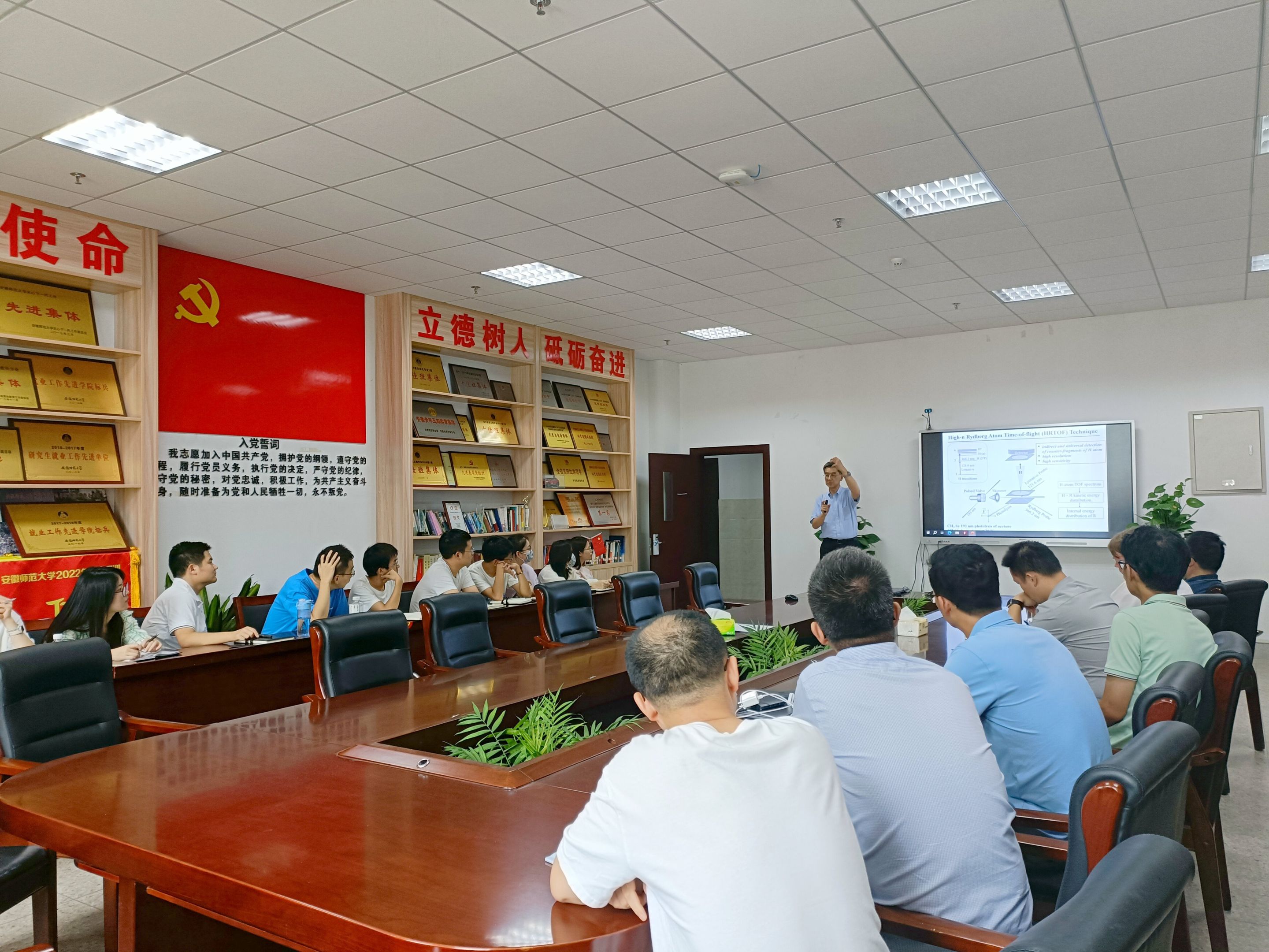 报告会上,张劲松教授简要介绍了烷基是碳氢化合物燃烧的重要中间体,并讲述了通过里德堡态激发研究了一系列典型烷基自由基(乙基、丙基、丁基、戊基和环己基)的紫外光解动力学。随后,张教授结合课题组的相关工作同与会师生分享了对伯烷基(乙基、正丙基、正丁基、正戊基)、仲烷基(异丙基和正丁基)、叔烷基(叔丁基)等的研究。在上述体系中,产物平动能释放谱显示出双峰结构,表明有两种不同的解离通道。其中,慢速且各向同性的产物对应于由里德堡态内转换至基态的热自由基的单分子解离通道。而快速且各向异性的产物来源于排斥的里德堡态的直接解离。会上,张教授还同与会师生讨论了光解离机理以及锥形交叉点在上述体系中的作用。报告会结束后,与会师生就相关问题同张劲松教授展开了热烈讨论和交流。