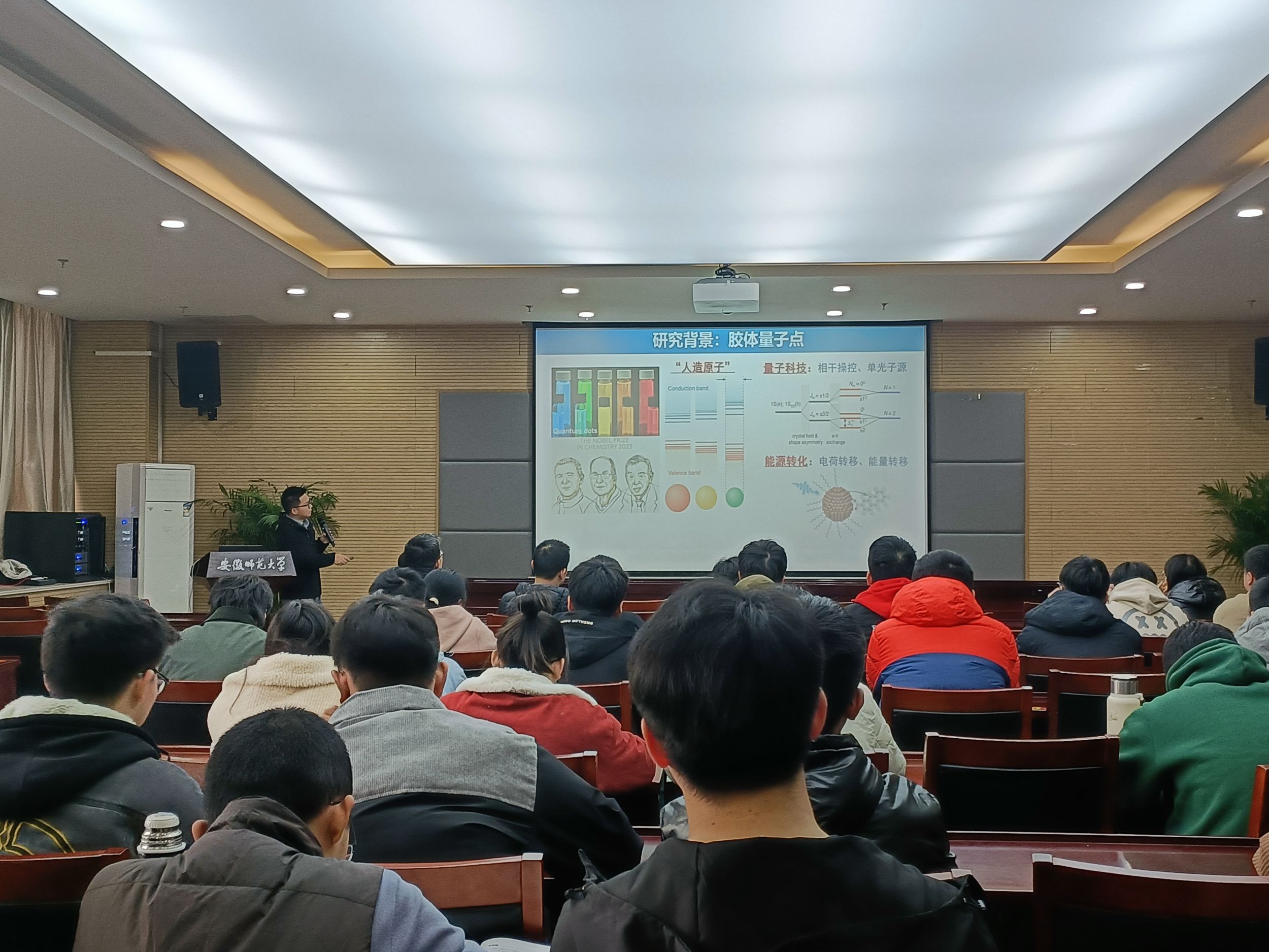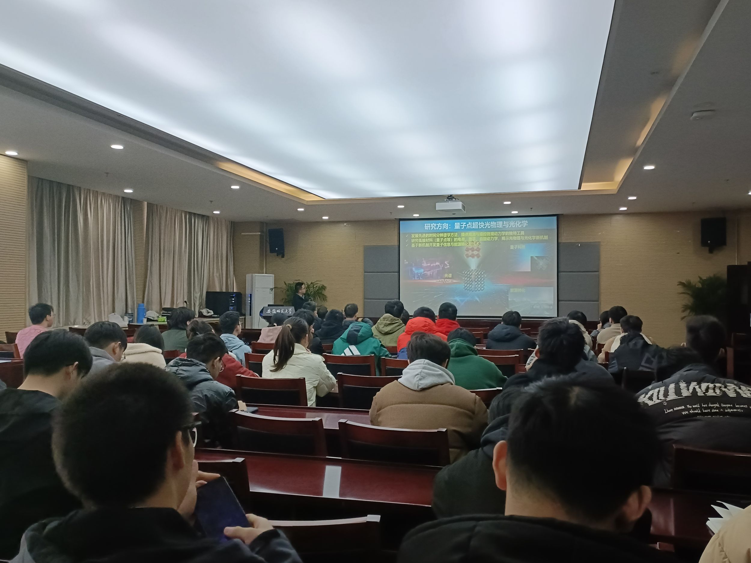 胶体量子点作为低维半导体材料,在量子信息和能源技术领域的广泛应用前景。报告会上,吴凯丰研究员重点介绍了他领导的团队近年来基于先进的时间分辨谱学方法,在量子点超快光物理与光化学动力学所取得的主要学术成果。他详细阐述了圆偏振瞬态磁光技术研究自旋动力学的原理,介绍了利用这一技术观测到的量子点激子精细能级劈裂现象与量子拍频新机制,展示了量子点自旋室温相干操控以及利用量子点-有机分子杂化自由基对的自旋量子相干特性实现三线态光化学反应的高效磁场调控等领域的最新研究进展。报告会结束后,与会师生就相关问题同吴凯丰研究员展开了热烈讨论和交流。