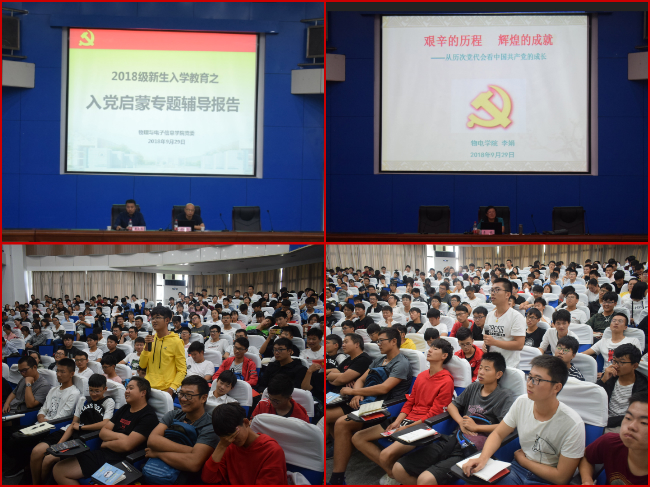 9月29日上午,组织部正处级组织员胡培亮和公司党委书记李娟为2018级新生作入党启蒙教育专题辅导报告。胡培亮以《入党ABC》为题,从申请入党条件、如何递交思想汇报、发展党员工作的四个阶段向新生们介绍入党的基本流程和注意事项,并与同学互动交流。李娟通过介绍历代党代会,向同学们讲述中国共产党艰辛的历程和辉煌的成就,在时间维度里感受中国共产党成长的不易。通过专题讲座的入党教育方式,促使新生自觉主动接受步入大学的首次精神洗礼,实现入学“早教育”。