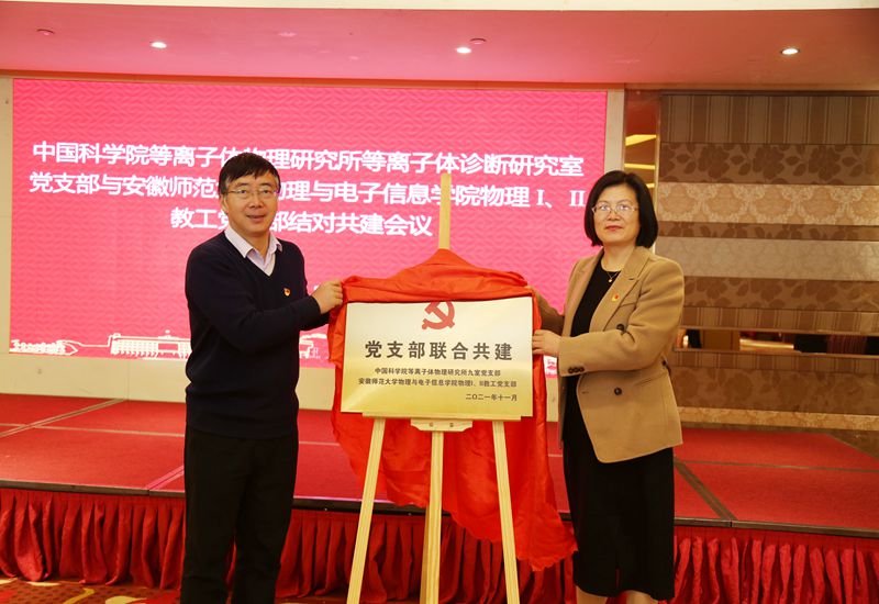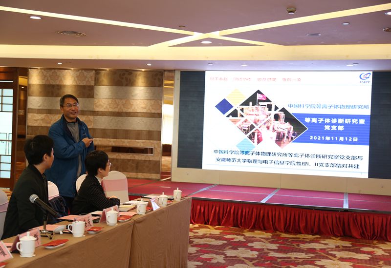 共建活动中,开展了“党旗在科研一线高高飘扬”活动,支部党员围绕学术研究领域的前沿问题进行研讨,中国科公司等离子体物理研究所等离子体诊断研究室党支部党员张凌、徐明分别就《EAST托卡马克杂质相关光谱诊断研究进展》、《EAST托卡马克MHD和高能粒子实验研究进展》进行汇报;m88物理一、二教工党支部党员赵春一、汪延志分别就《钙钛矿载流子动力学及应用研究》和《若干拓展的自旋-玻色模型-丰富的量子相变》进行汇报。与会人员认真听取现场汇报,并围绕以上研究领域开展深入交流与讨论。