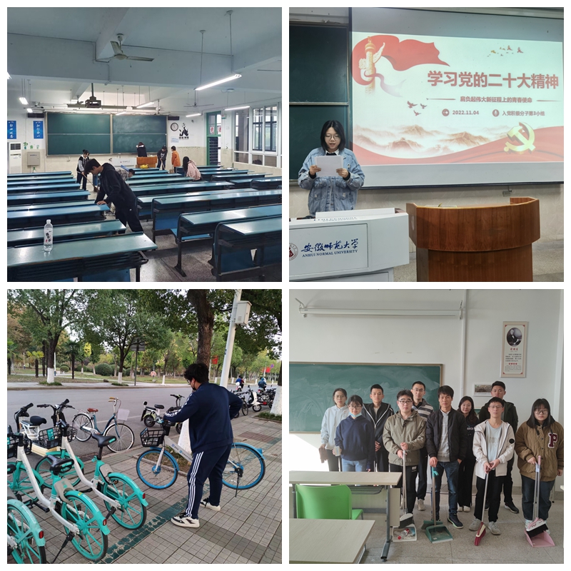 一名党员就是一面旗帜。培训班坚持理论与实践教育相结合,积极搭建学员参与志愿服务的实践平台。理论课后各小组分别围绕二十大精神宣讲、实验室整理、自行车摆放等志愿服务活动积极主动开展实践活动,用实际行动践行党的宗旨。