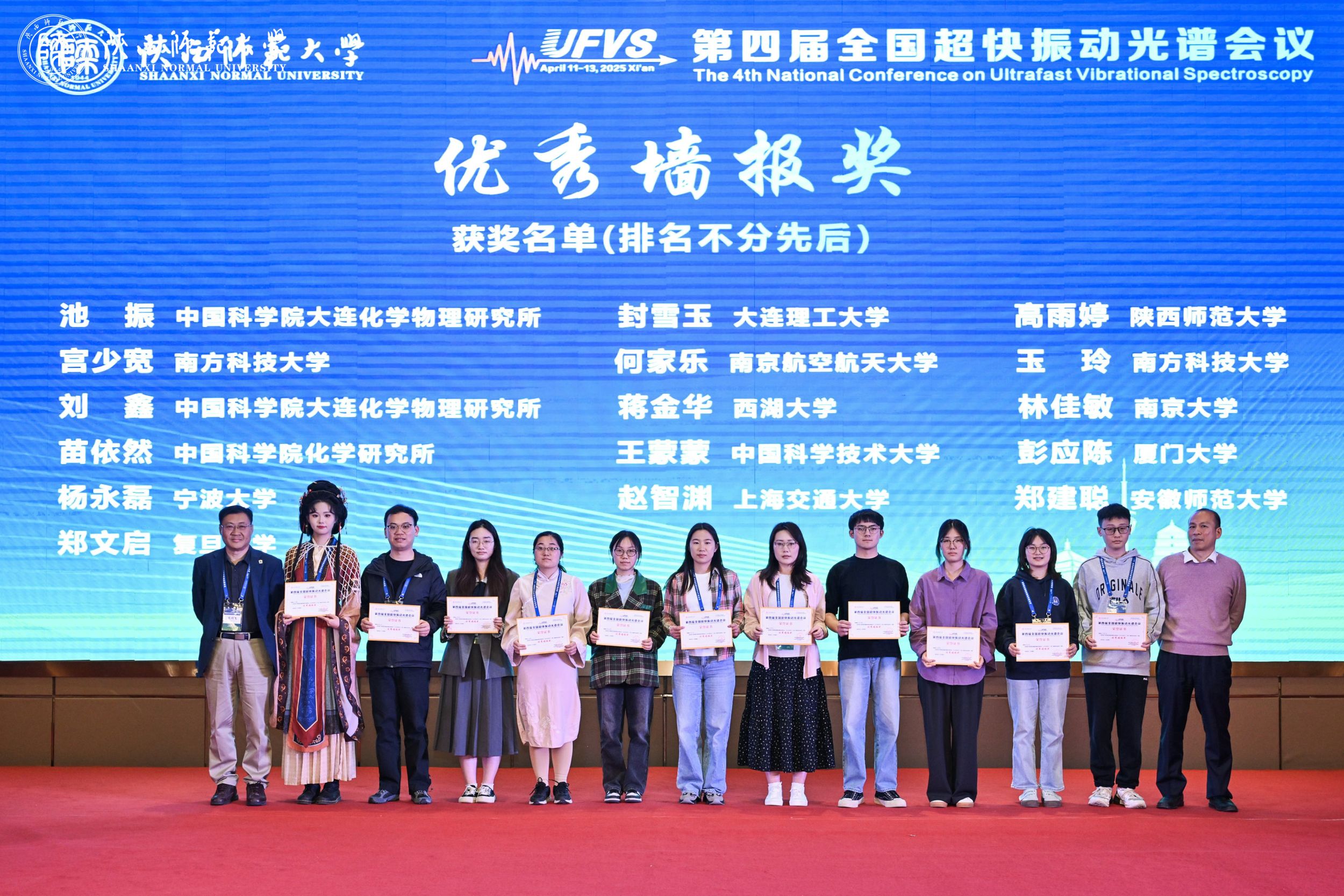 2025年4月11日至13日,由陕西师范大学化学化工公司和应用表面与胶体化学教育部重点实验室主办的第四届全国超快振动光谱会议在西安斯瑞特酒店成功召开。全国40余家单位的200多名代表出席会议。到会专家围绕“时间分辨红外光谱与飞秒多维振动光谱”、“和频振动光谱”、“稳态及时间分辨拉曼光谱”、“时间分辨太赫兹光谱”、“红外与太赫兹光源”、“超快振动光谱理论”、“超快电子光谱中的电子-振动耦合与电子-声子散射现象”等七个主题,充分探讨和交流了超快振动光谱领域最新研究进展以及相关理论计算和实验技术的发展。课题组陆洲教授应邀在会议上作了题为《低维碘化铅钙钛矿和频振动光谱及电声耦合研究》的学术报告。课题组郑建聪、梁超龙和吴章友三位同学参加了会议并以墙报形式分别汇报了《高度畸变手性二维铅基钙钛矿和频振动光谱及载流子超快动力学研究》、《碳酸酯类电解液溶剂界面和频振动光谱研究》和《锂离子电池硅电极/电解液界面分子结构的和频光谱研究》等方面的研究进展,充分展示了m88官网非线性光谱与超快动力学研究组青年学子的风采。经专家评选,郑建聪同学荣获优秀墙报奖。