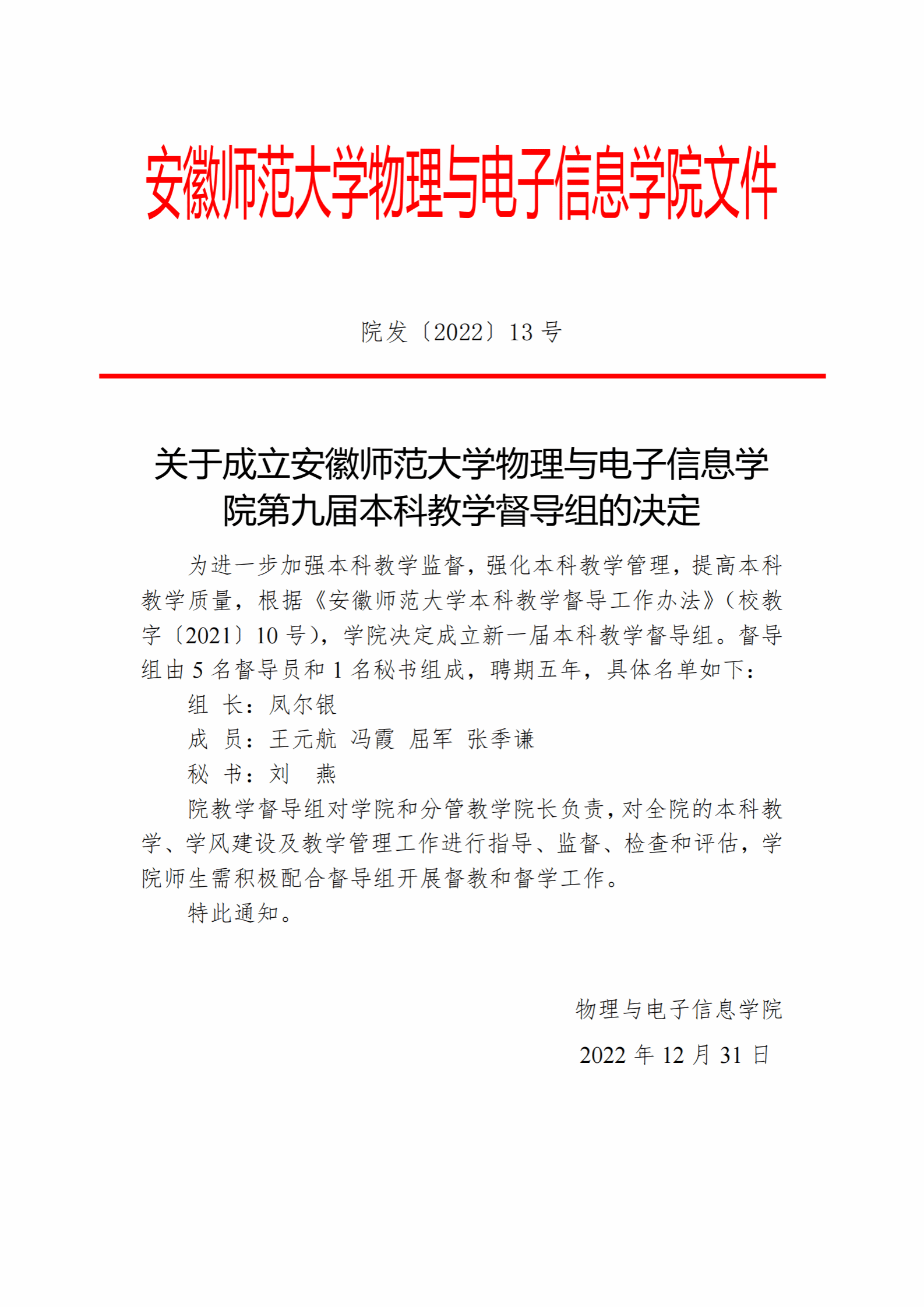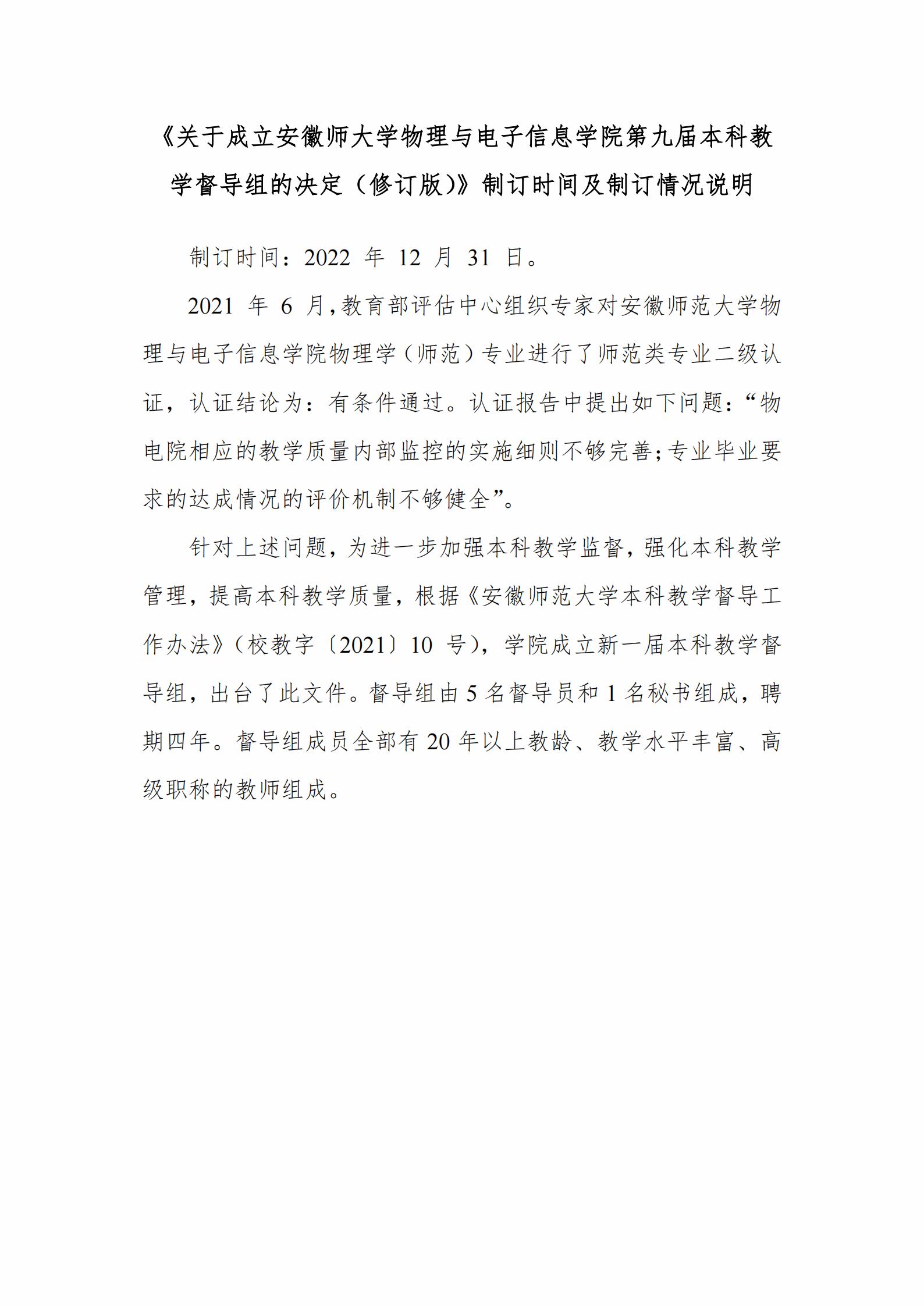 《关于成立安徽师大学m88第九届本科教学督导组的决定(修订版)》及制订情况说明